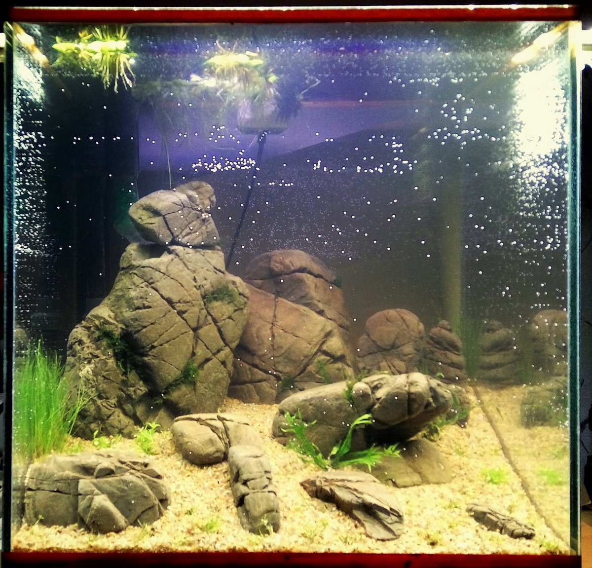 Наконец наступил момент, когда нужно было что то предпринимать с аквариумом. Не останавливая его, были извлечены камни и часть растений. Грунт соответственно осел и стал ровным. Из старого остался коврик монте карло, хемиантус микронтемоидес, и стаурогин коричневый с гидрокотилой трипартитой.