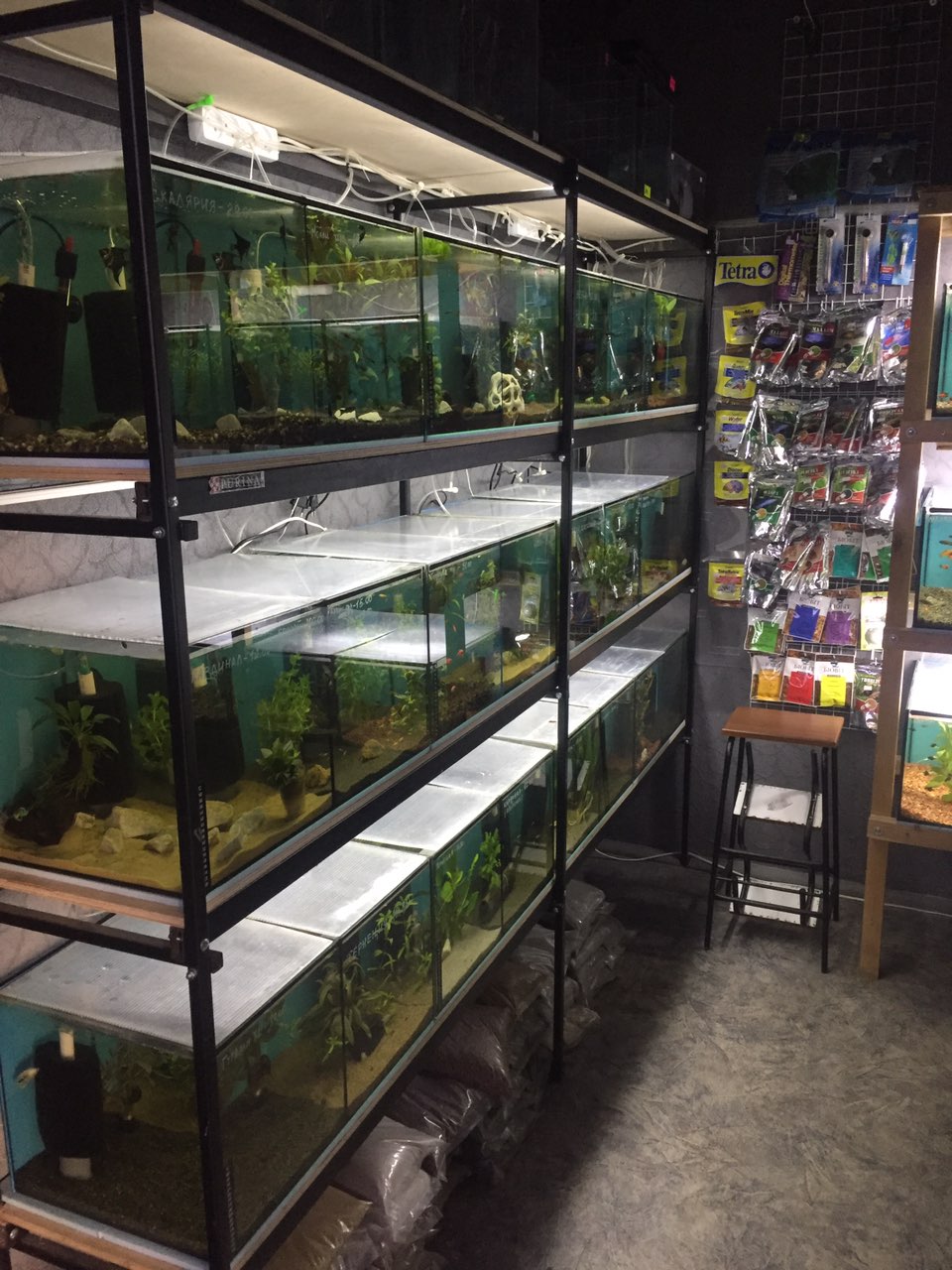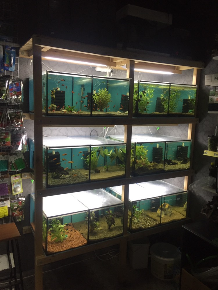 В каждом аквариуме нагреватель и аэрлифтный фильтр, а также грунт + разводка для воздуха.
