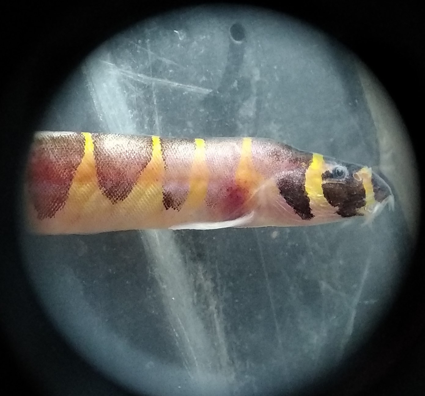 Всі риби що вмирають- нові. Сьогодні здох молодий акантофтальмус (з нових риб). Дуже рвався до поверхні і падав на дно. Підривався і тікав, допоки знесилений не впав. Візуально від центру тіла ан спині до голови пропала пігментація. То не слиз, не грибкова плесінь, нікого нальоту. Роздивлявся в лупу. Тільки пропала пігментація. Шкіра чиста. Але справа на боку біля жабер помітив червоні кровяні точечки. Наче полопали капіляри. Або то укупи саразита. Можливо схоже було і у сомика.