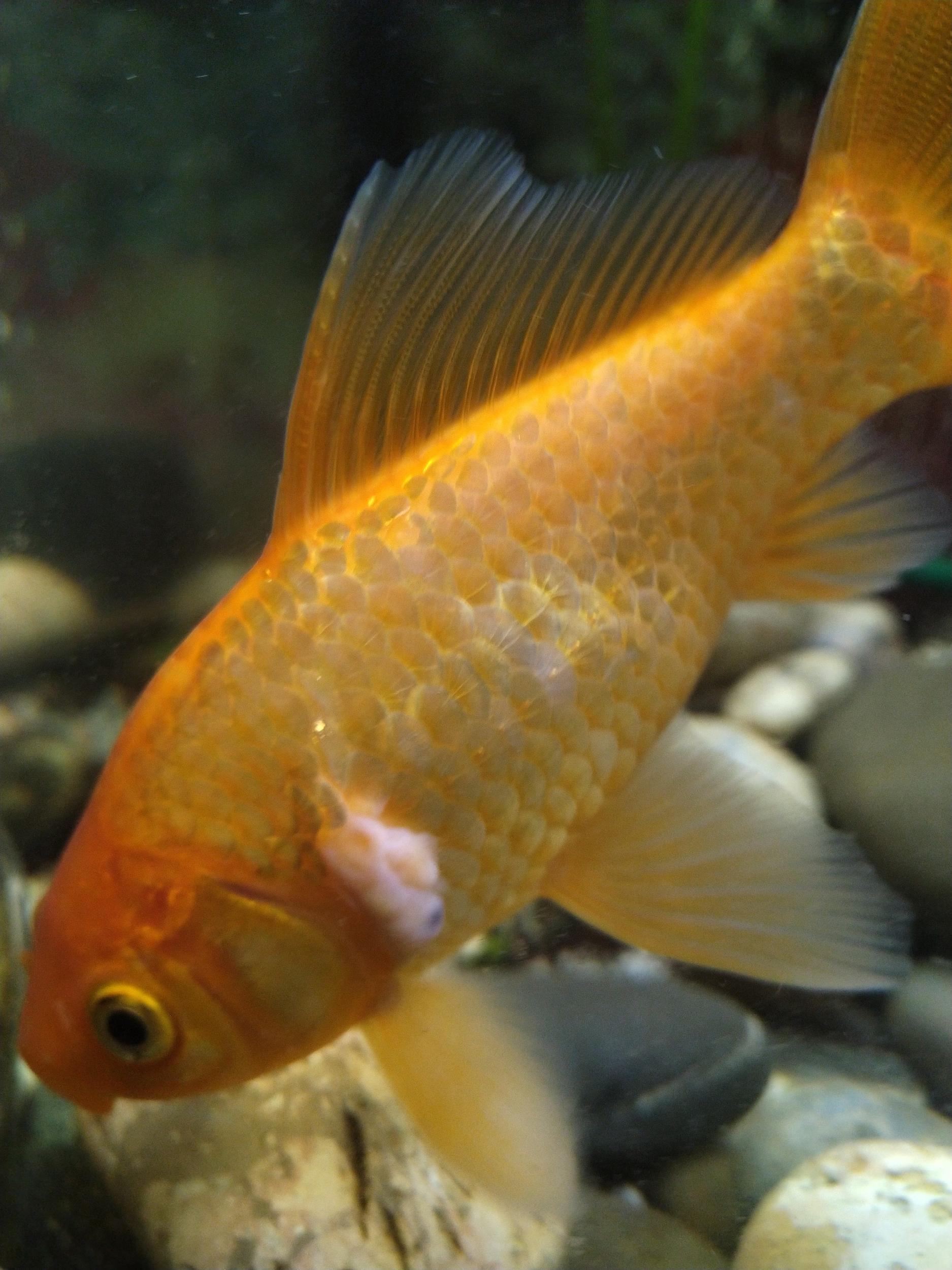 Здравствуйте. Помогите определить болезнь золотой рыбы. Животное длиной 12 см, опухоль примерно 10*15 мм, медленно растёт около 2 месяцев, выпуклая, белая, с чёрной точкой внутри и едва заметным красными прожилками. Ведёт себя рыба активно, хорошо ест, подозрительного в поведении не замечено. У остальных рыб заболеваний не замечено.