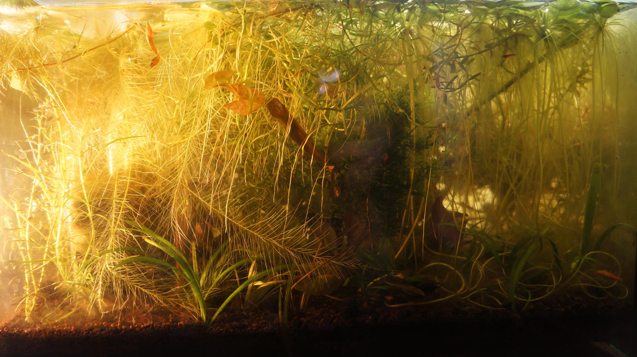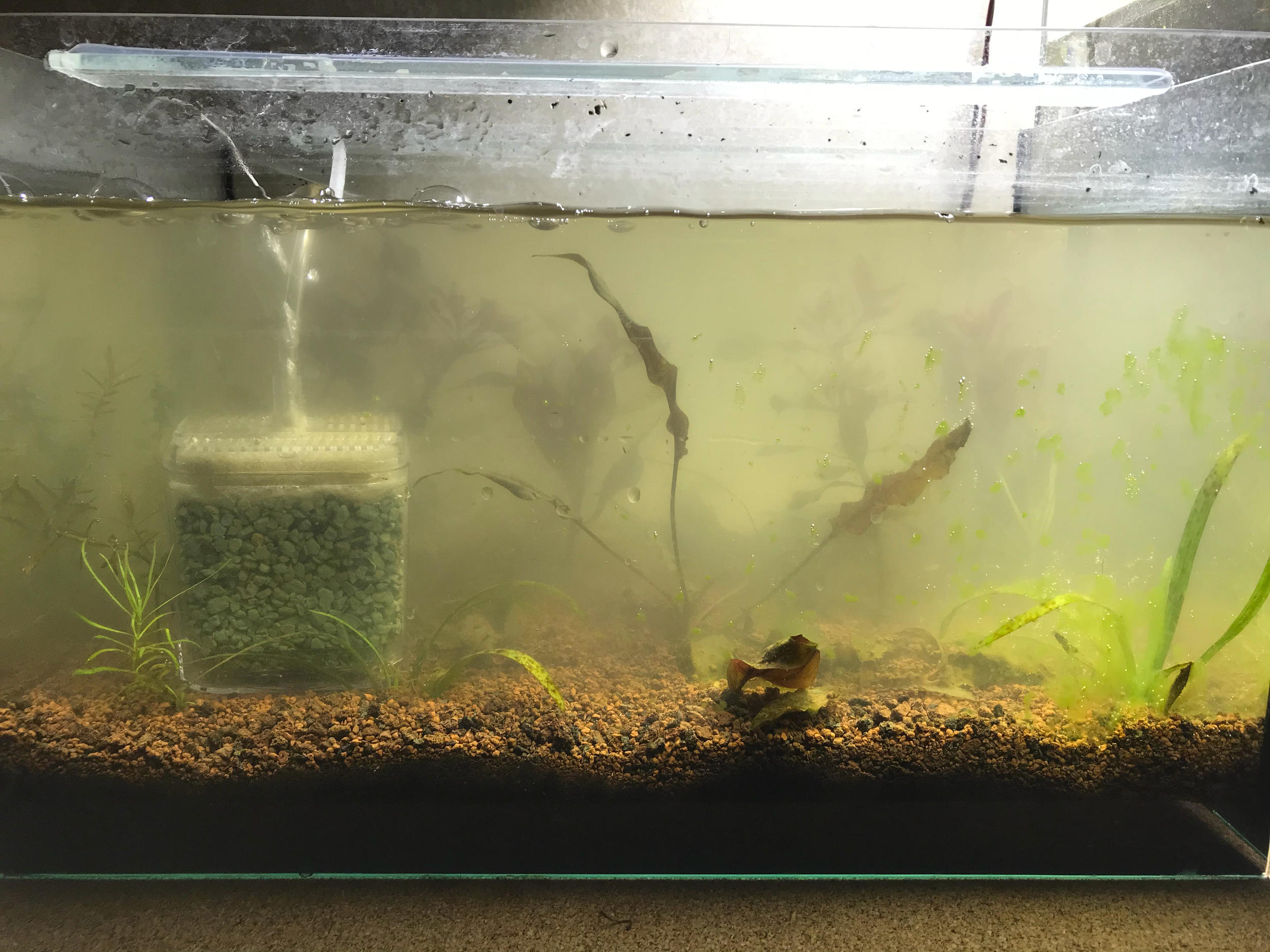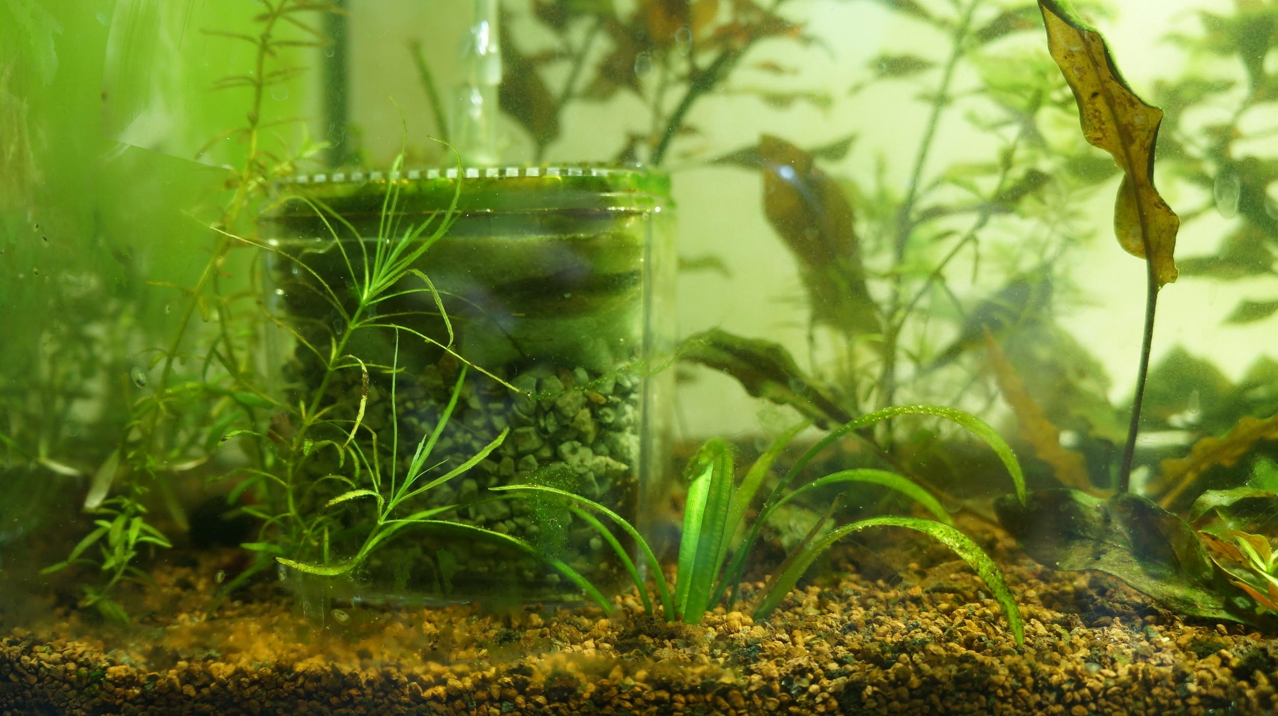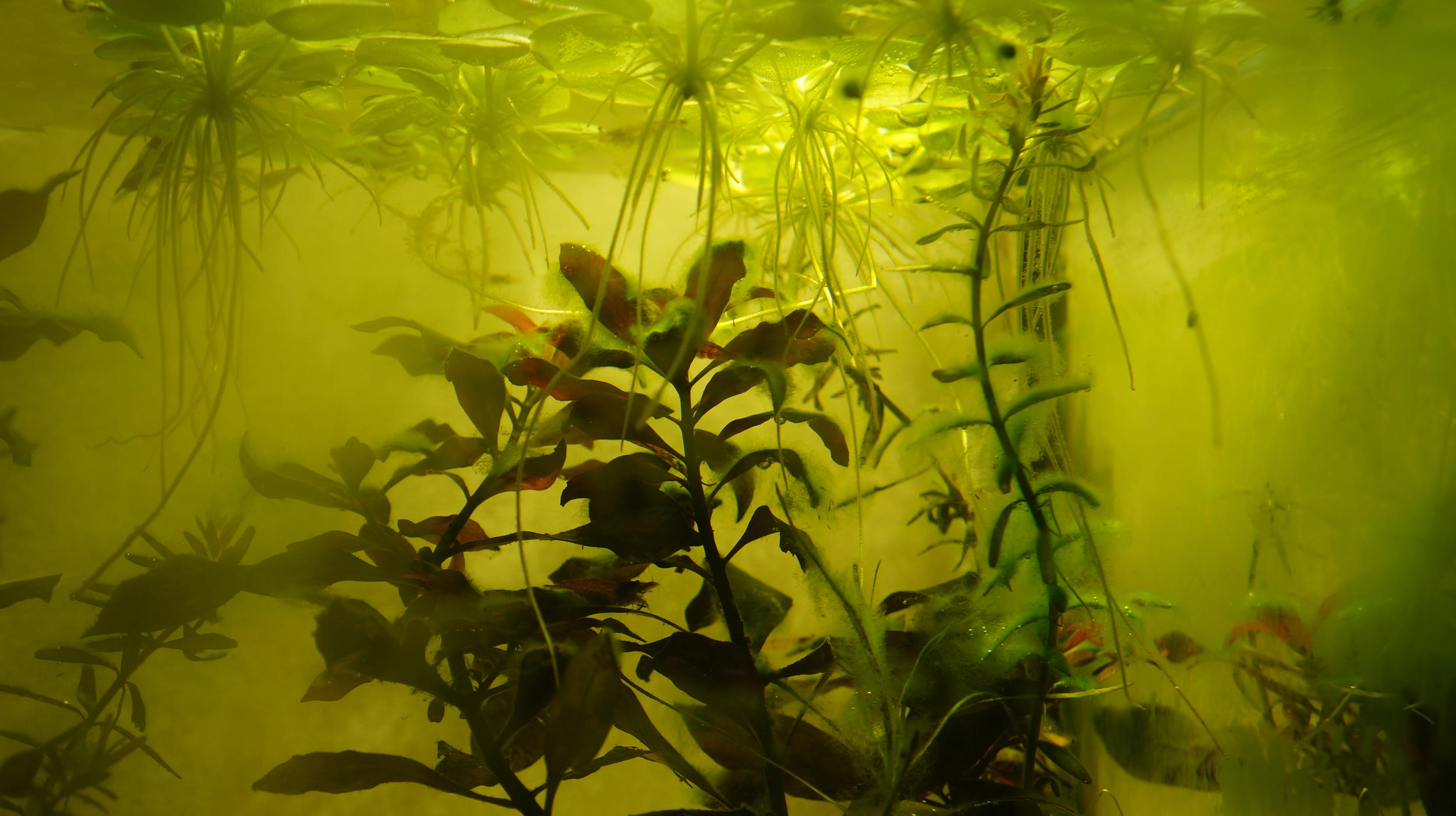 В 25 литровом появился салатовый налет на стенках, листьях, салатовые нитки. Все это не вызывало особого эстетического дисонанса у меня и легко контролировалось притенением. Стоило чем то закрыть доступ света к участку с водорослями на 3 дня - и они пропадали.