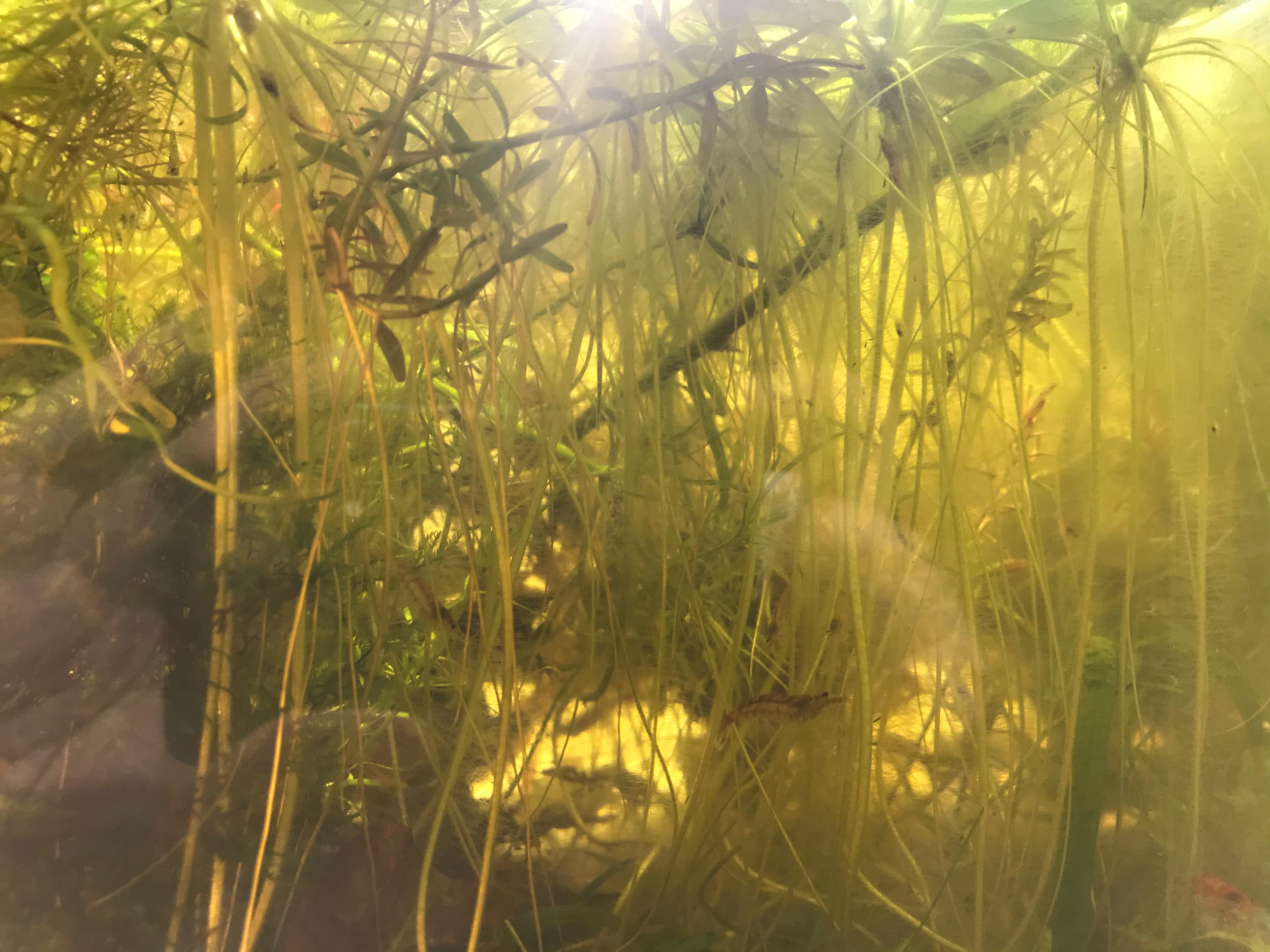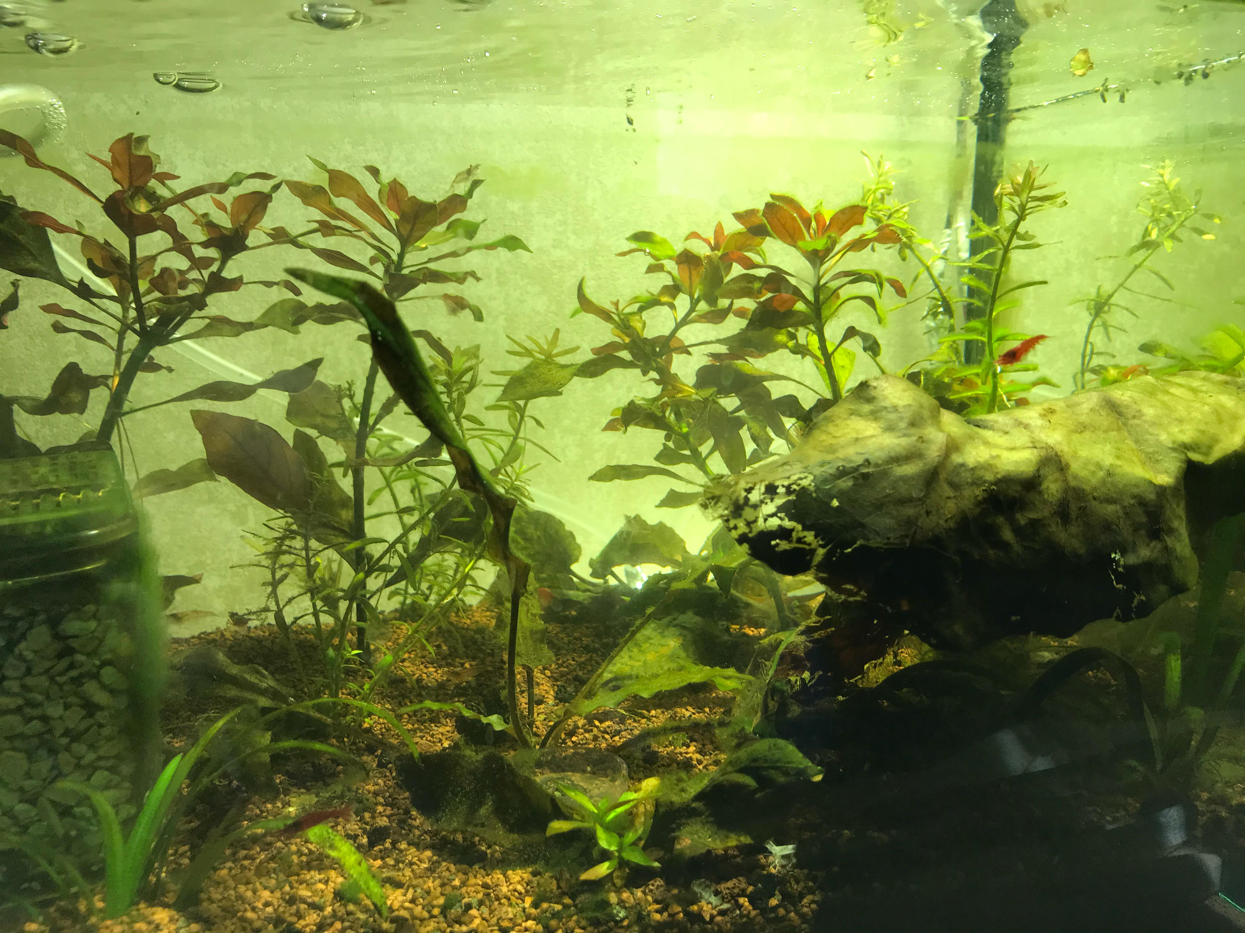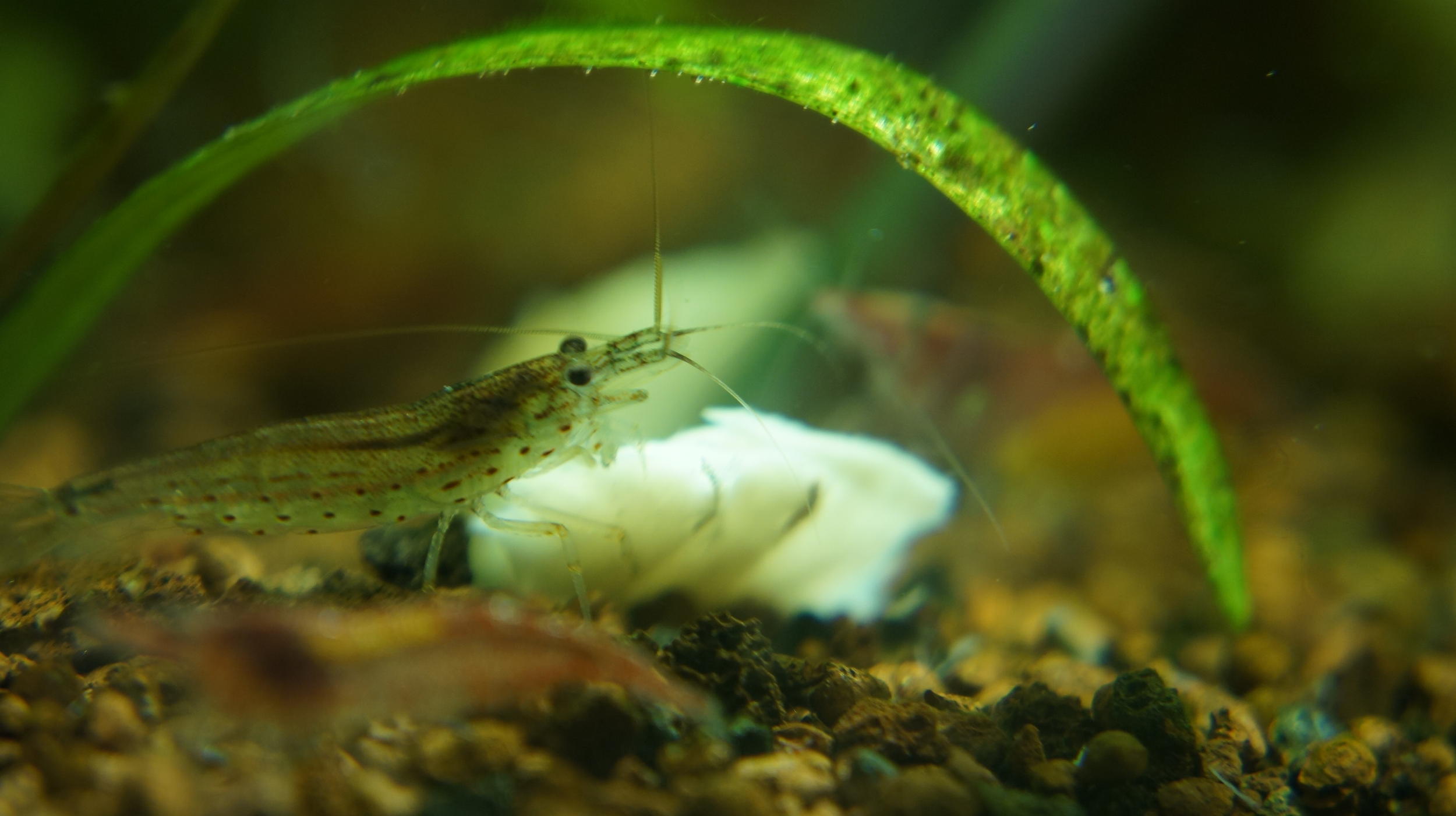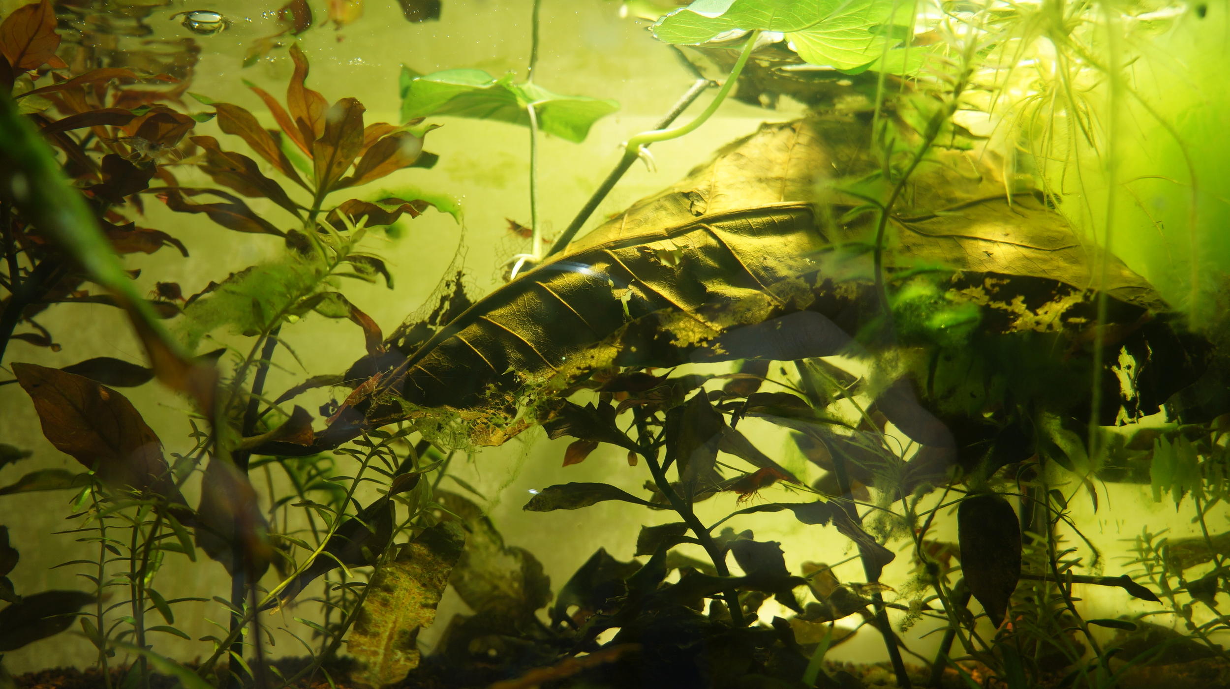 Это придало мне уверенности и я сделал ошибку. Для борьбы с водорослями во втором, проблемном аквариуме, я купил 4 небольших креветок Амано. После того, как я посадил их в аквариум, они начали быстро плавать по кругу и пытаться вылезти из воды наружу (см. фото).