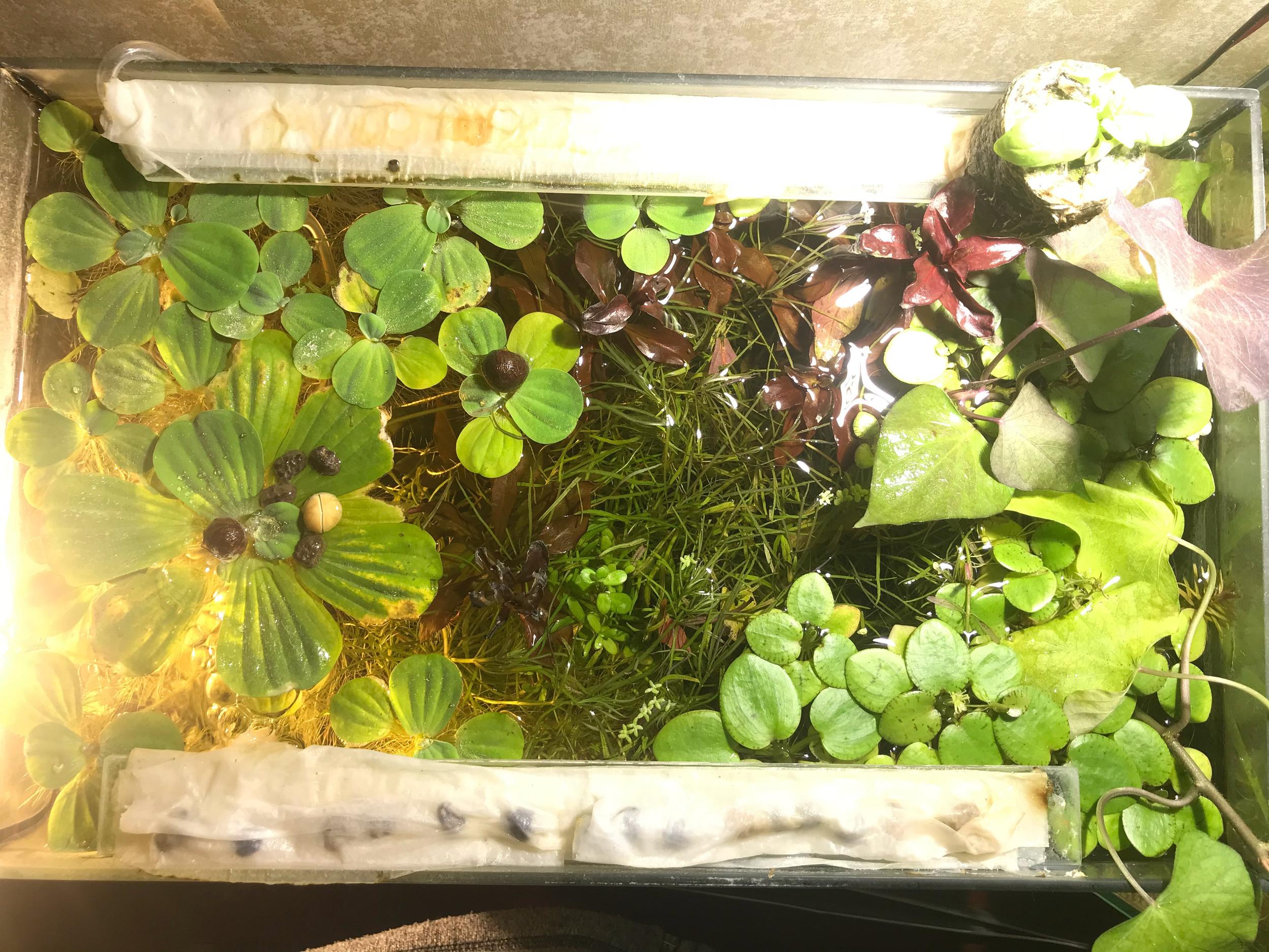 Сейчас я убрал плавающие растения из 25 литрового аквариума. Но растений в нем все равно слишком много. Я планирую запускать аквариум на 75 литров, поэтому пока держу излишек растений. Также в 25 литровом расплодилось очень много криветок чери. Ума не приложу что с ними делать. И как контролировать популяцию. Отвез бы кому то - но, карантин...
