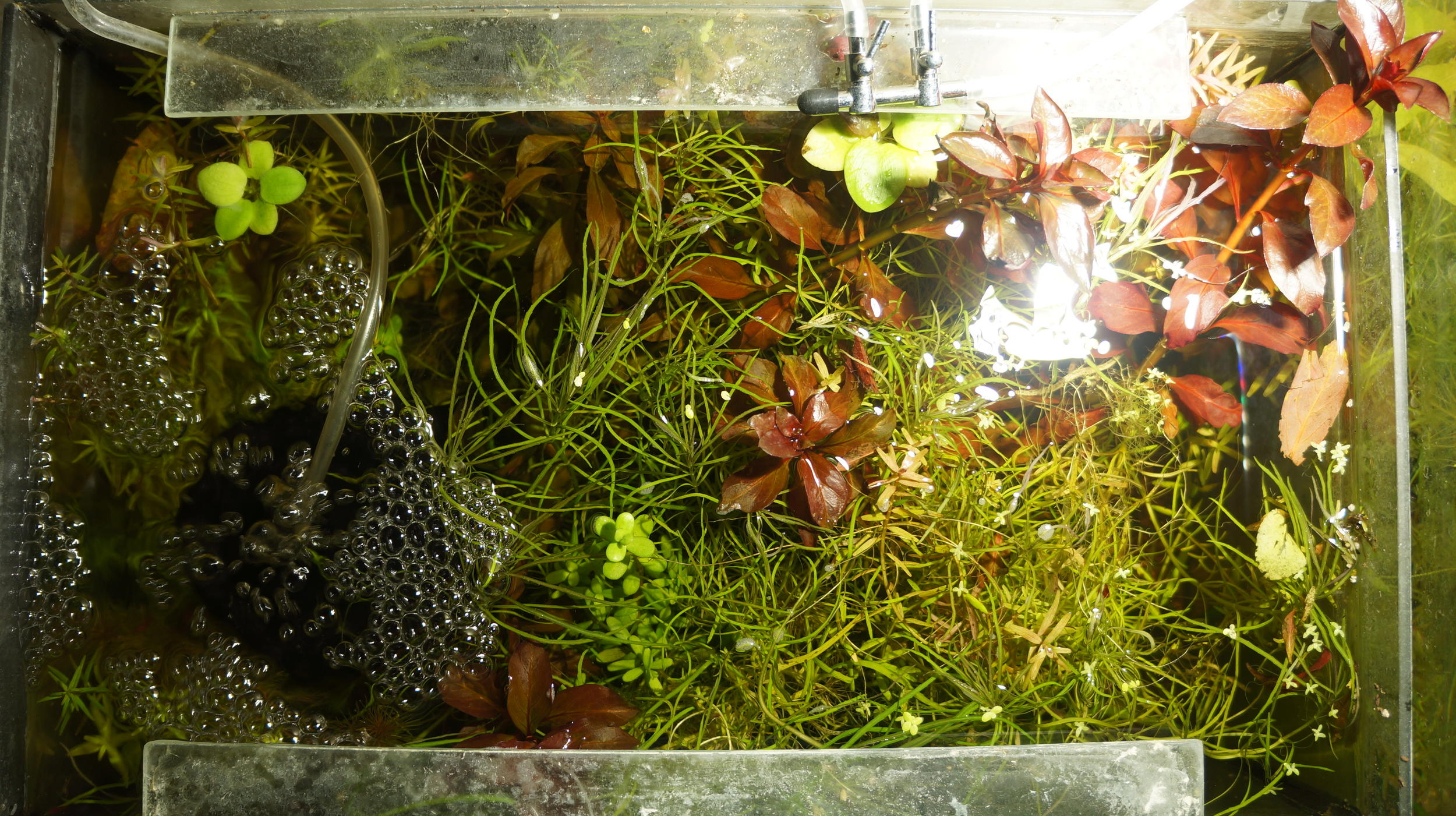 Растения: получил несколько банок с водой и растениями от коллеги-аквариумиста. Не знаю как все называются. Больше всего пока нравится людвигия супер ред.