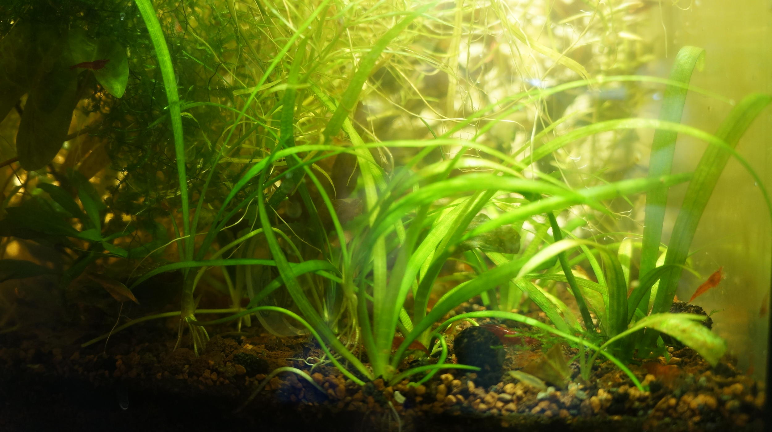 Но аквариум сильно зарос их корнями. Даже креветки чери с трудом проберались.