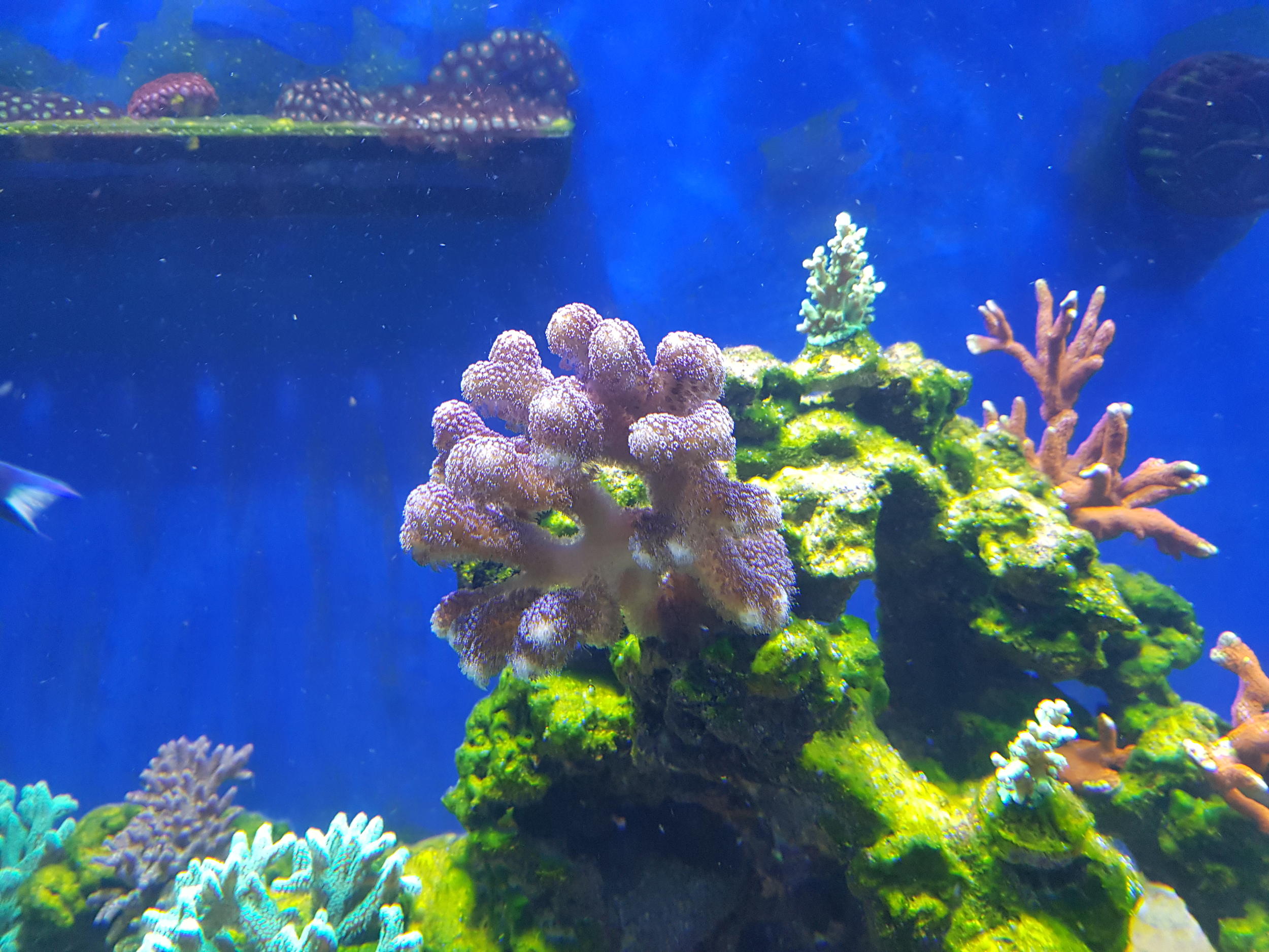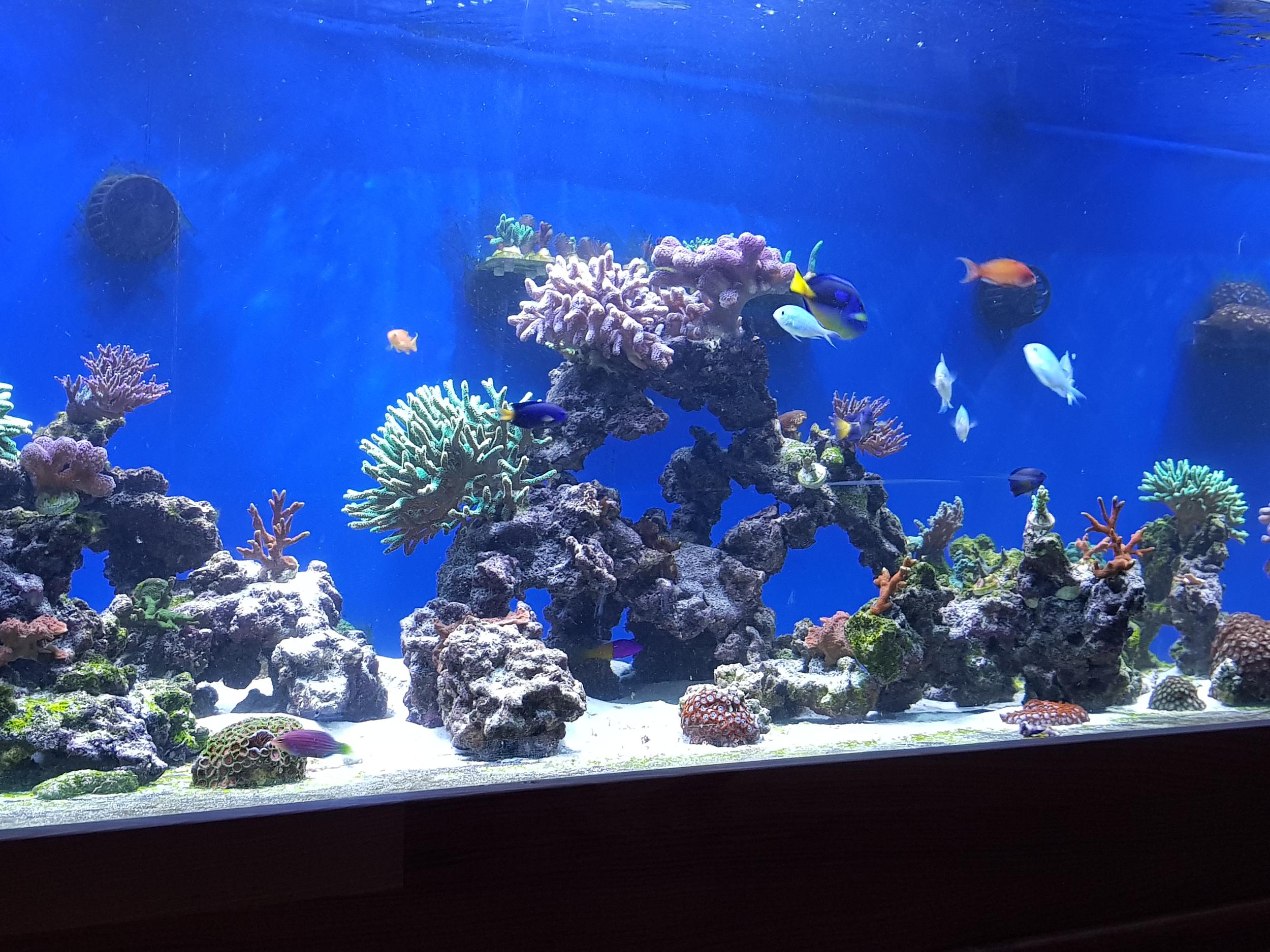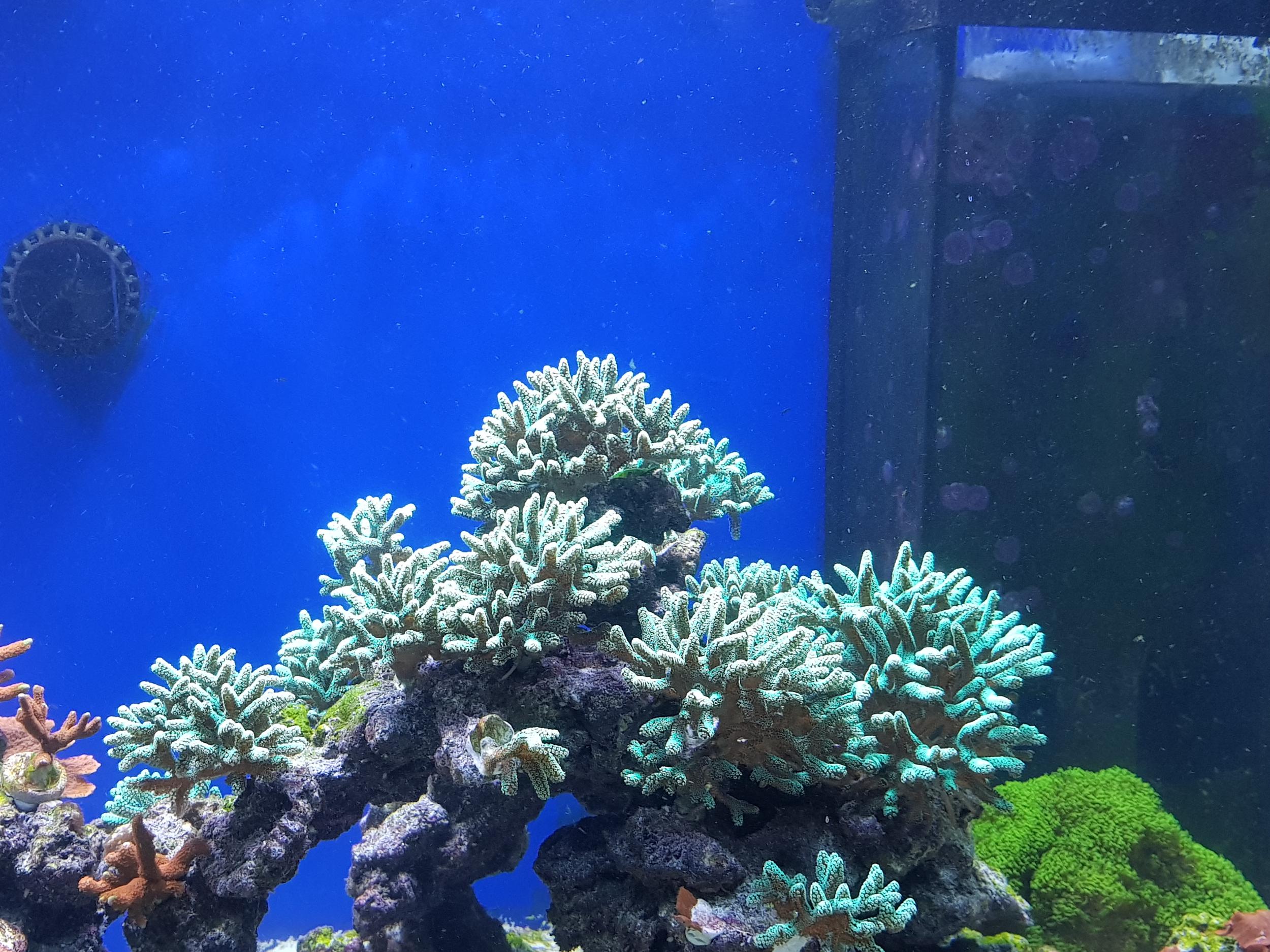 Как видите вода все еще мутная от песка. Покупных кораллов не было все со старой банки. Сериатопора и часть акр потеряли насыщенность цвета, но все что было помещено в банку выжило и начало ударно расти. дальше будут фото все ярче и ярче. ничего в банку не покупал, а фраговал и рассаживал по мере роста