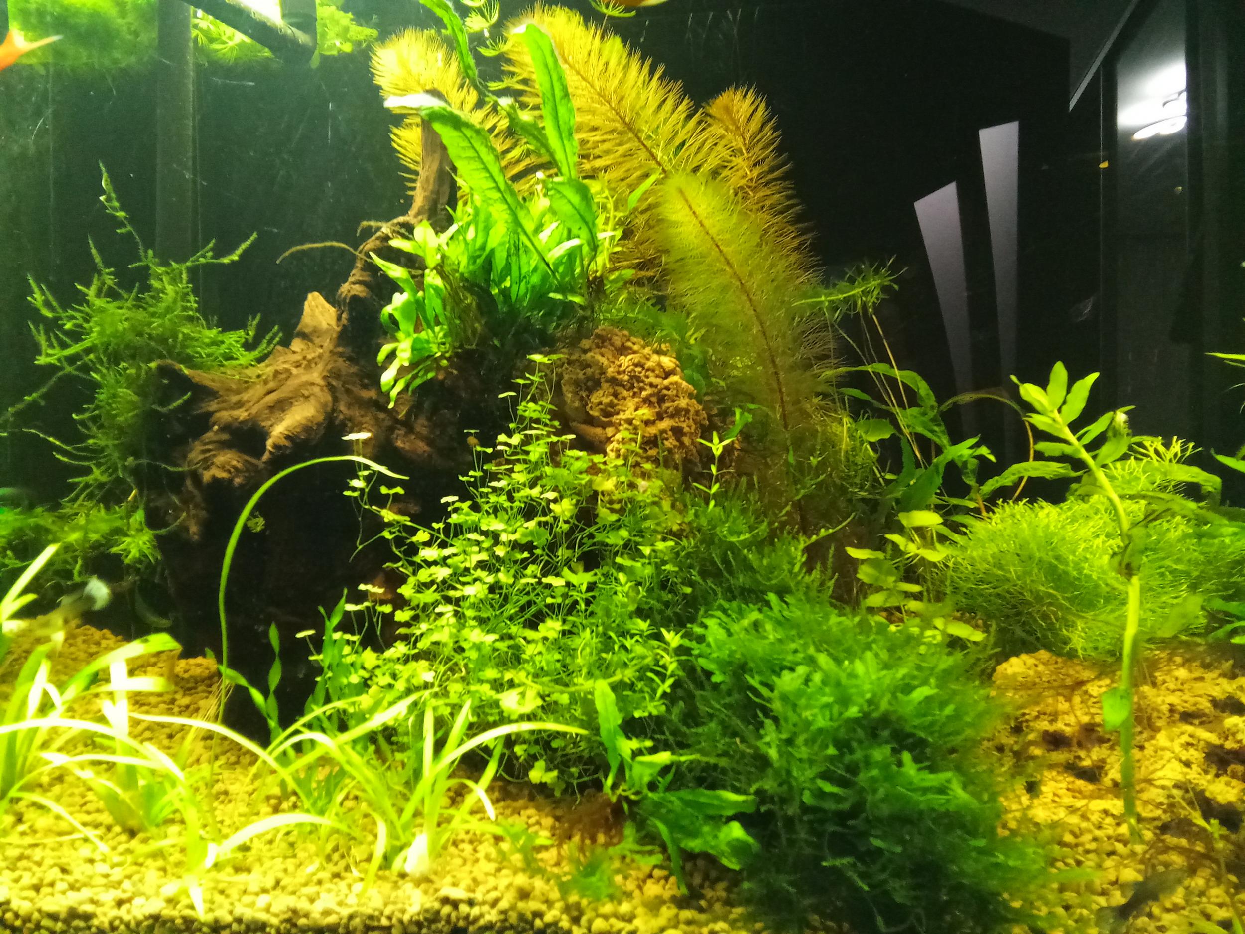 Итак,залит месяц назад,первую травку посадил через две недели,потом через неделю поселил первопроходцев(6 анцитрусов 2,5-3см.и две ампулярии,а также штук 20 неокардин простых.Размер аквариума 120-45-55,свет Светодиодный общ.мощностьи где то 120 Вт.Грунт-керамзит 2-5мм,фильтр внешний джебо839,наполнитель полностью сетка для овощей.Пока свет 5 ч ,сегодня добавил ещё растений завтра выложу фото.Коряги пока не тонут одну приложил камнем,вторую та что справа распер трубкой из пластика.Дале будет...