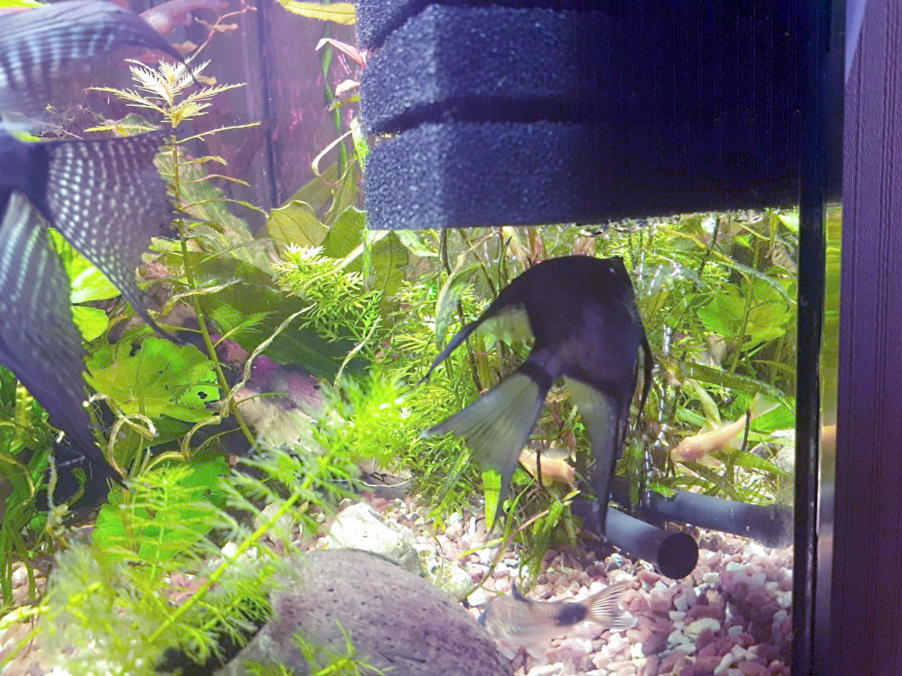 Всем здравия. История такова: После 6-летнего перерыва, снова завёл аквас, только маленький - 150л. Запустил жителей: 3 скаляры, нанокары (подростки), присоски, коридорасы, акантики, макробрахи, барбусы пятиполосые (ещё мальки 2-3 см) и пару афиосемионов. Забыв, что в первое время нужно ограничивать освещение, сразу стал светить полный световой день - 8-9 часов. Сразу получил водоросли , поэтому стал лить сайдекс, но, без фанатизма, по инструкции. Пока лил сайдекс - упустил начало манки - не думал, что она появится в моём аквасе. Сайдекс лить перестал. Пока начал лечение от манки (Medica Contralck Plus), нанокары ушли за радугу, а также одна скаляра. После курса лечения, манка исчезла, но одна скаляра ничего не ест. Причём она перестала есть с началом лечения и вот уже ок 3-х недель ничего не ест. И стоит долго под губкой фильтра. А самка афиосемиона, проплывая мимо, иногда её пощипывает за плавники или хвост (на фото и видео видно, что плавники и хвост у этой скаляры пощипанные). Иногда к ней подплывает другая скаляра и они плавают вместе по всему аквасу. А теперь вот уже 3-й день и вторая скаляра стала плохо есть - только когда мотыль падает на неё, а специально она за ним не гоняется. Причём, кроме мотыля скаляры ничего не едят, сухой корм сразу выплёвуют. Другие рыбы чувствуют себя хорошо. Температура воды 26-28 град, вода чистая, подмены регулярно, даже чаще из-за лечения. Аэрация хорошая + от дождевалки хорошее течение на поверхности воды. Подскажите, почему не ест скаляра? Это ж не дискус, который может обидеться и не есть долго...