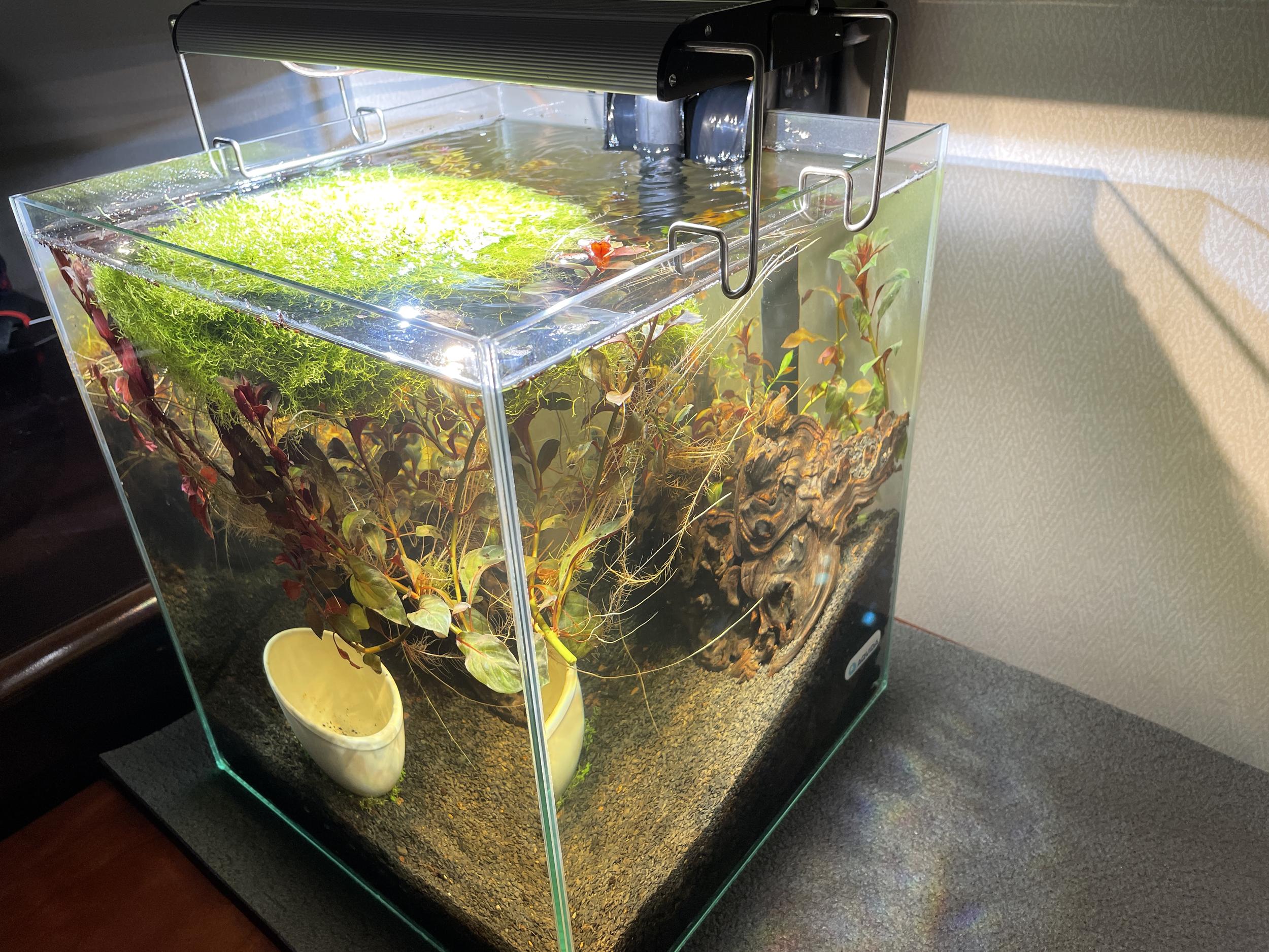 Никак не могу придумать что посадить на задний план (за корягой). Там от грунта до поверхности воды 20 см, из которых коряга закрывает около 8см. Может Alternanthera reineckii minima? Или может Hemianthus micranthemoides? Изначально думал Rotala indica 'Bonsai' - но не сложилось купить. Хотя, это вопрос решаемый, нужно просто еще одна посылка.