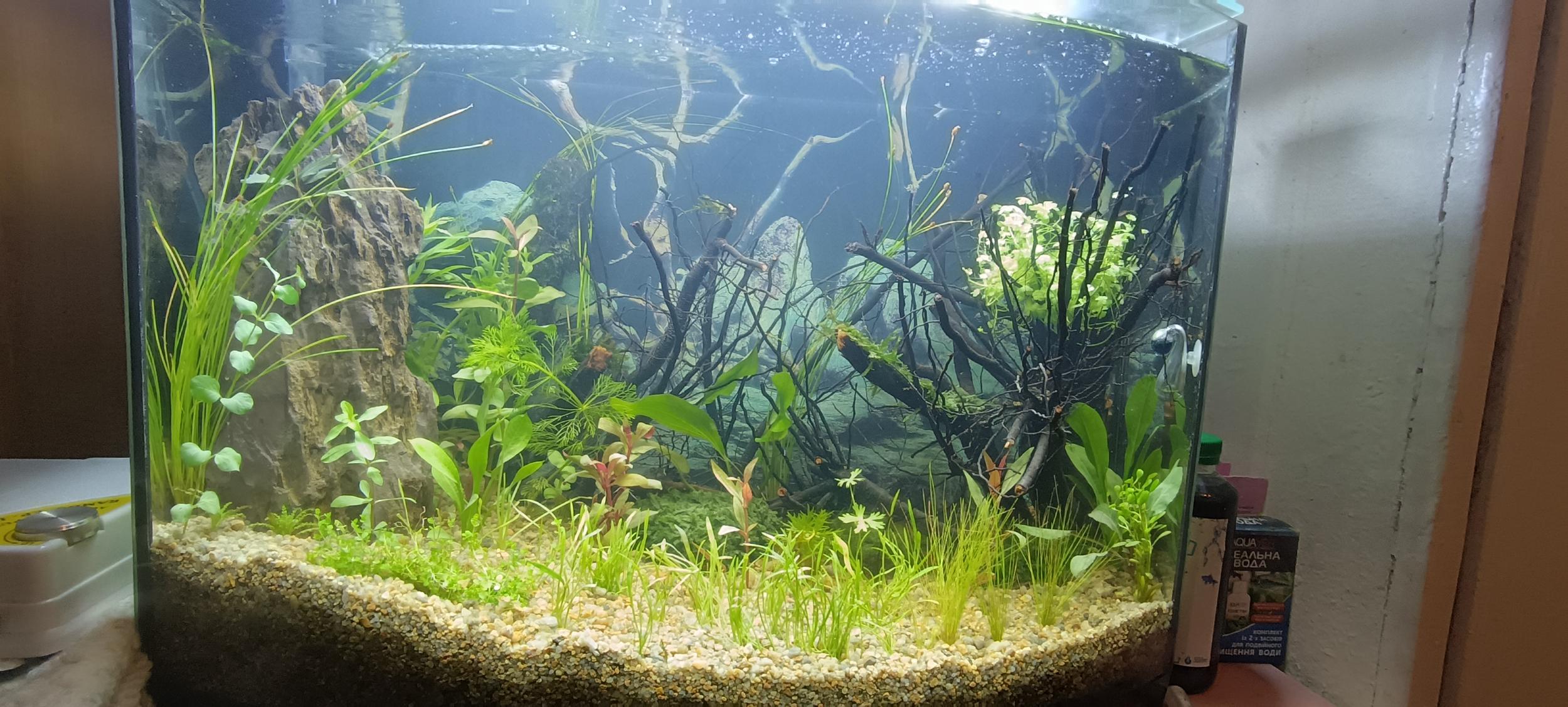 Прошлый аквариум запускал особо не заморачиваясь на водопроводе сразу закинув растения рыб и простоял он 2 года и вообще проблем не было ,по крайней мере со старта ,здесь же водоросли попёрли очень быстро (боюсь что лилеопсис и ситняг загнутся если дальше водоросли попрут)
