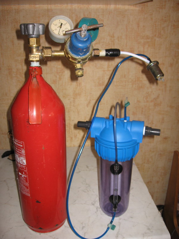 Баллон 4,5 литра (огнетушитель с вентилем), редуктор, игольчатый клапан, магнитный клапан, счетчик пузырьков, реактор.