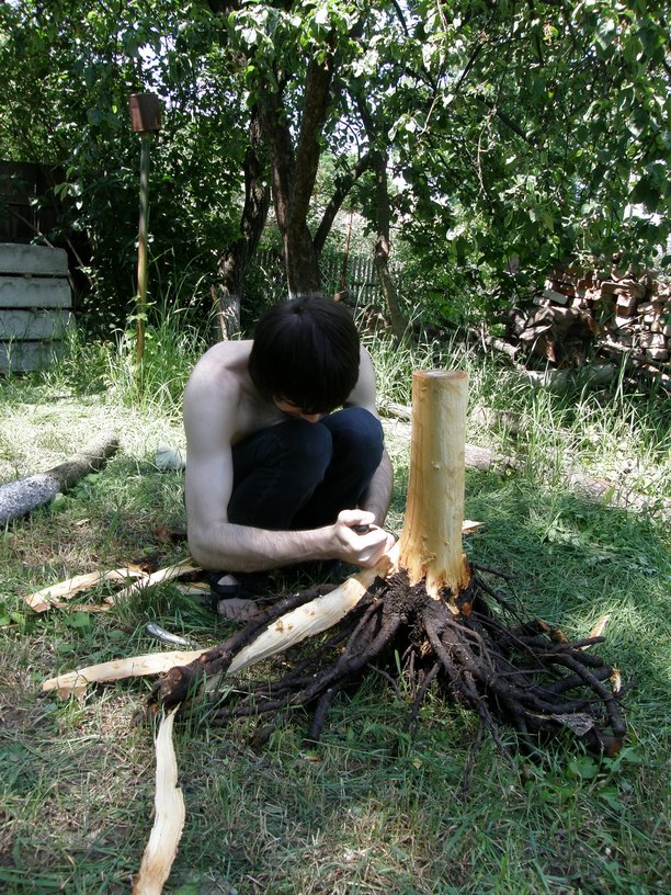 Выкопал, ободрал кору (занятие для мазохистов; после варки размокшая кора обдирается на ура, но кора сильно красит воду и дерево). Нашел старую ванную, поставил ее на костер. Понаблюдал за лицом продавщицы, у которой я купил 12кг соли. Спалил весь мусор на даче, вываривая ее день в соленом растворе, время от времени переворачивая, т.к. вся она не погружалась в воду даже в ванной. Потом еще один день в чистой воде без соли. (Интересны мысли соседей наблюдавших как молодой человек на костре в ванной варит бородатый пень, переворачивая, перемешивая и доливая воду, вот уже целый день). Потом еще дней 7-10 она лежала и кисла в воде с подменами раз в 2-3 дня.