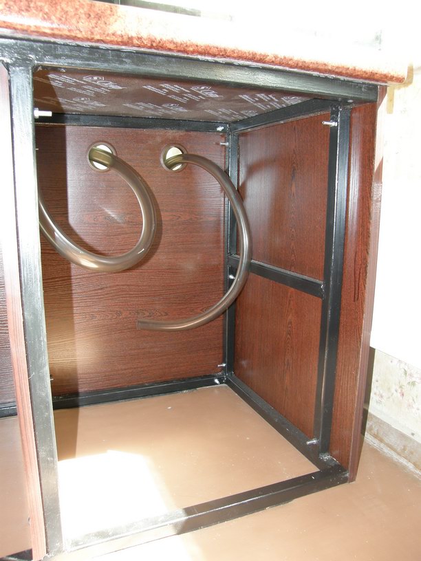 Из этого делаем вывод: тумбу нужно делать каркасную, но обязательно на регулируемых ножках. Так же нужно обязательно делать доступ за тумбу, т.е. заднюю стенку не глухую.