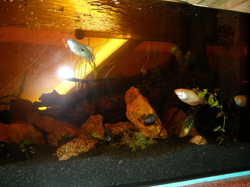 Отловил остатки рыбы из маленькой аквы (два дня ушло, т.к. никак не мог поймать одного анцитруса и двух неизвестных мне полосатых хитрожопов, которые спрятались и устроили мне инсцинировку "Защита замка"; может, кто подскажет их название?) и пересадил всех в большую. Забрал у друга брата еще несколько взрослых рыб. Все плавают и радуются жизни. Вода прозрачная, неприятного запаха нет.