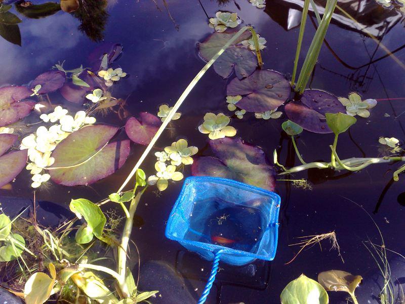 вот мой маленький прудик, всё лето в нём золотушки с пецилиями жили, сегодня я их отловила, немного одичали ребята, но выглядят вполне упитанными.