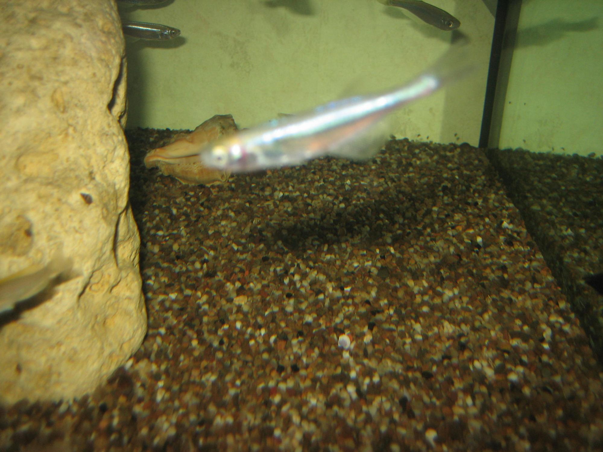 нереста, производители почти целиком заполняют выбранную щель икрой (диаметром около 3мм). Через 30–40 мин оболочка икры затвердевает так, что ее трудно раздавить даже пальцами. Инкубационный период длится 3–6 недель, причем в мягкой воде развитие идет быстрее. Личинки вылупляются только ночью и представляют собой маленькие подвижные ниточки длиной до 8мм. На изменение освещенности они реагируют с молниеносной быстротой. Стартовый корм – коловратка, науплии артемии и циклопа.