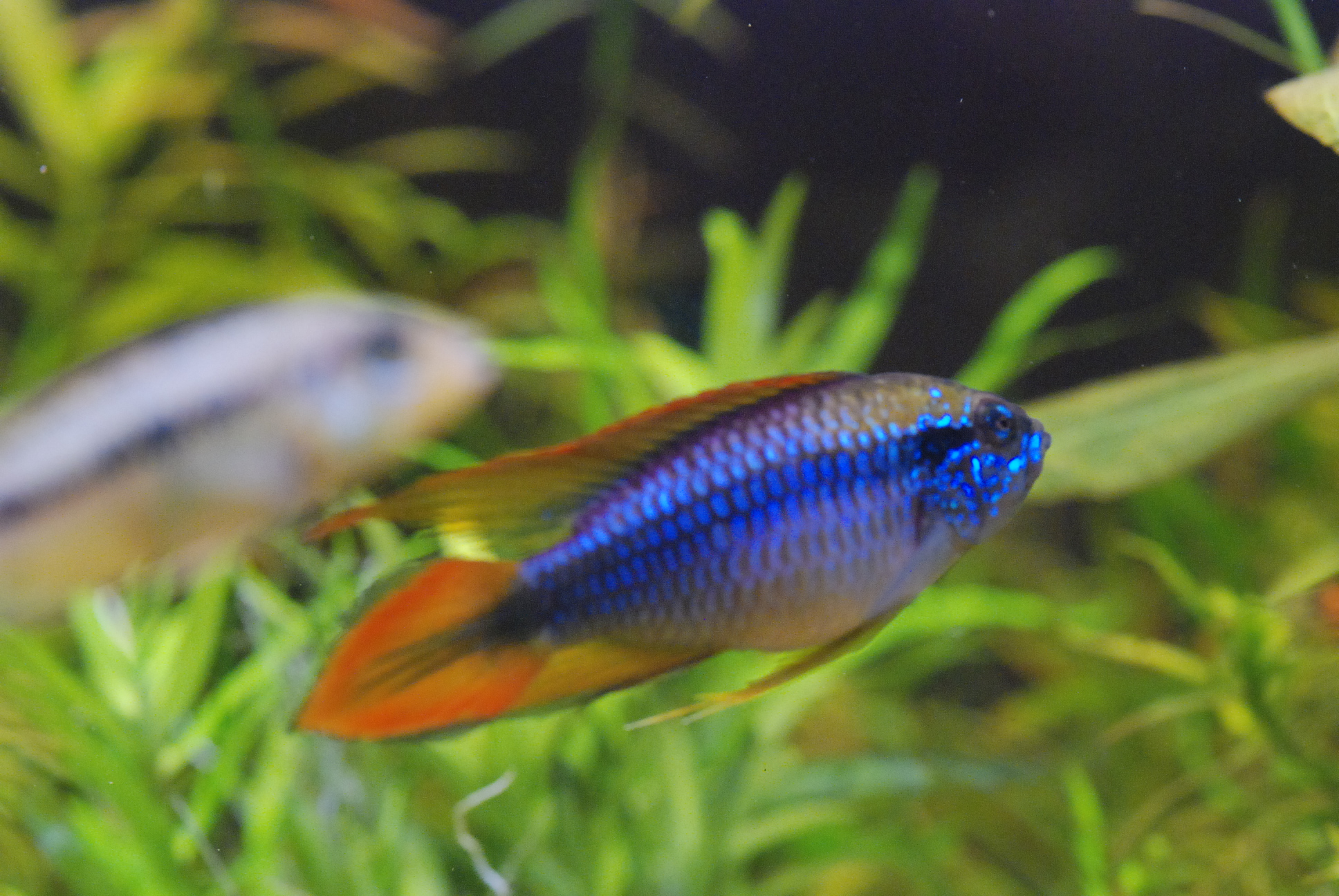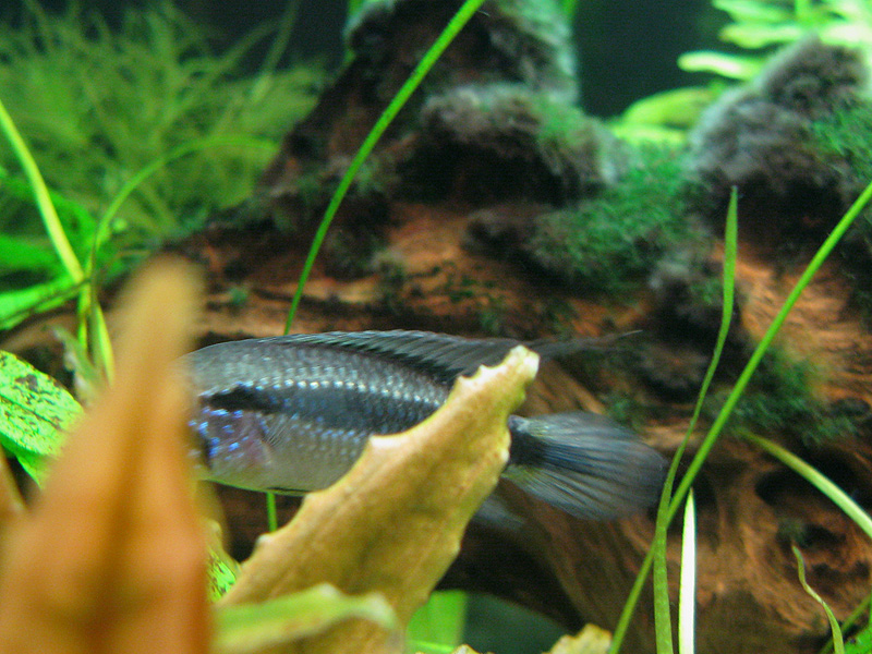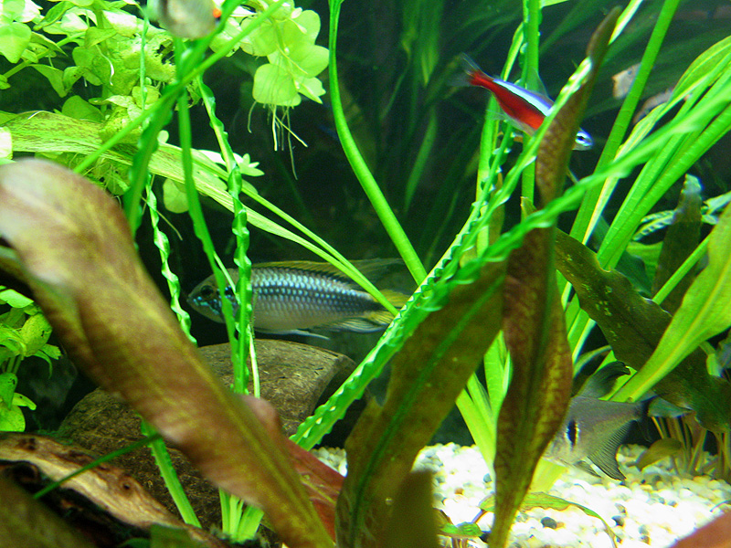 Рыбки у меня совсем недавно и еще не проявили себя по полной. Прошу опытных помочь разобраться, какого пола эта апистограмма. Сравнивала с фото в инете - на самку не похожа и на самца тоже... Смущает вытянутый и заостренный верхний плавник, цвет рыбки и отсутствие пятна на боку. Но размер очень даже девичий и формой аккуратной мородочки похожа на самку-какдушку. Самец (на последнем фото для сравнения) потихоньку начал обращать на нее внимание. Сравнивая с телодвижениями самцов других видов апистограм - это похоже на заигрывание. Хотя может он тоже еще не разобрался  ...