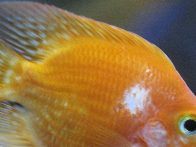 Недавно приобрел попугаев (оранжевых), и сегодня заметил у одного белое пятно с боку, немного с лахмотями и на жабрах тоже. Попугаев никто не обижает не гоняет, размером они сантиметров 8(может поранились)? Едят нормально ума не приложу, что это, подскажите пожалуйста , че делать?