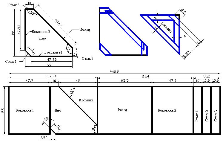 Намалевал в том же угле акву с острыми углами, вписавши её точно по месту. Теперь вопрос: сгодится ли на это 6мм? Передняя стенка выходит 1000 мм, не мало, ребро однозначно. Боковые стенки по 600 и 800 мм тоже с рёбрами надо. Выполнение швов и размеры стёкол на раскрой на втором рисунке.