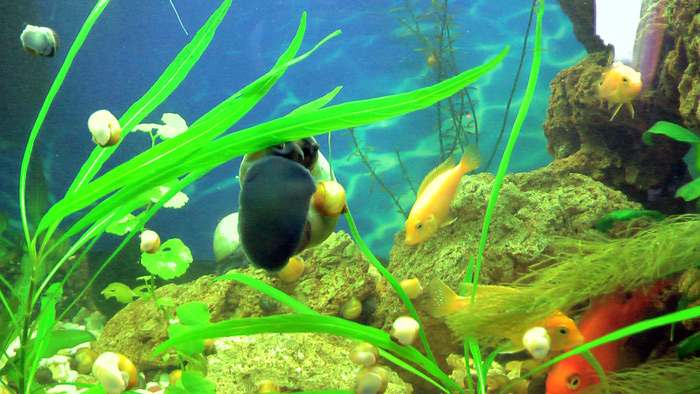 Ампулярии желтые, коричневые и синие. Размер примерно, как две копейки, есть чуть больше, есть поменьше. Полный аквариум. Цена - по гривне.