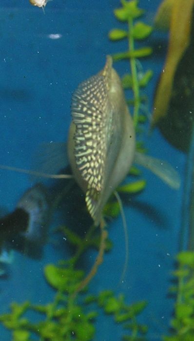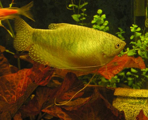 Мраморный гурами (фото 5): Часто подолгу стоит неподвижно с вытянутыми вперед брюшными плавниками (на фото характерная поза), при этом не прячется, обычно стоит на открытом пространстве посреди аквариума. Длина рыбы - 10 см. от носа до кончика хвоста. Аппетит нормальный.