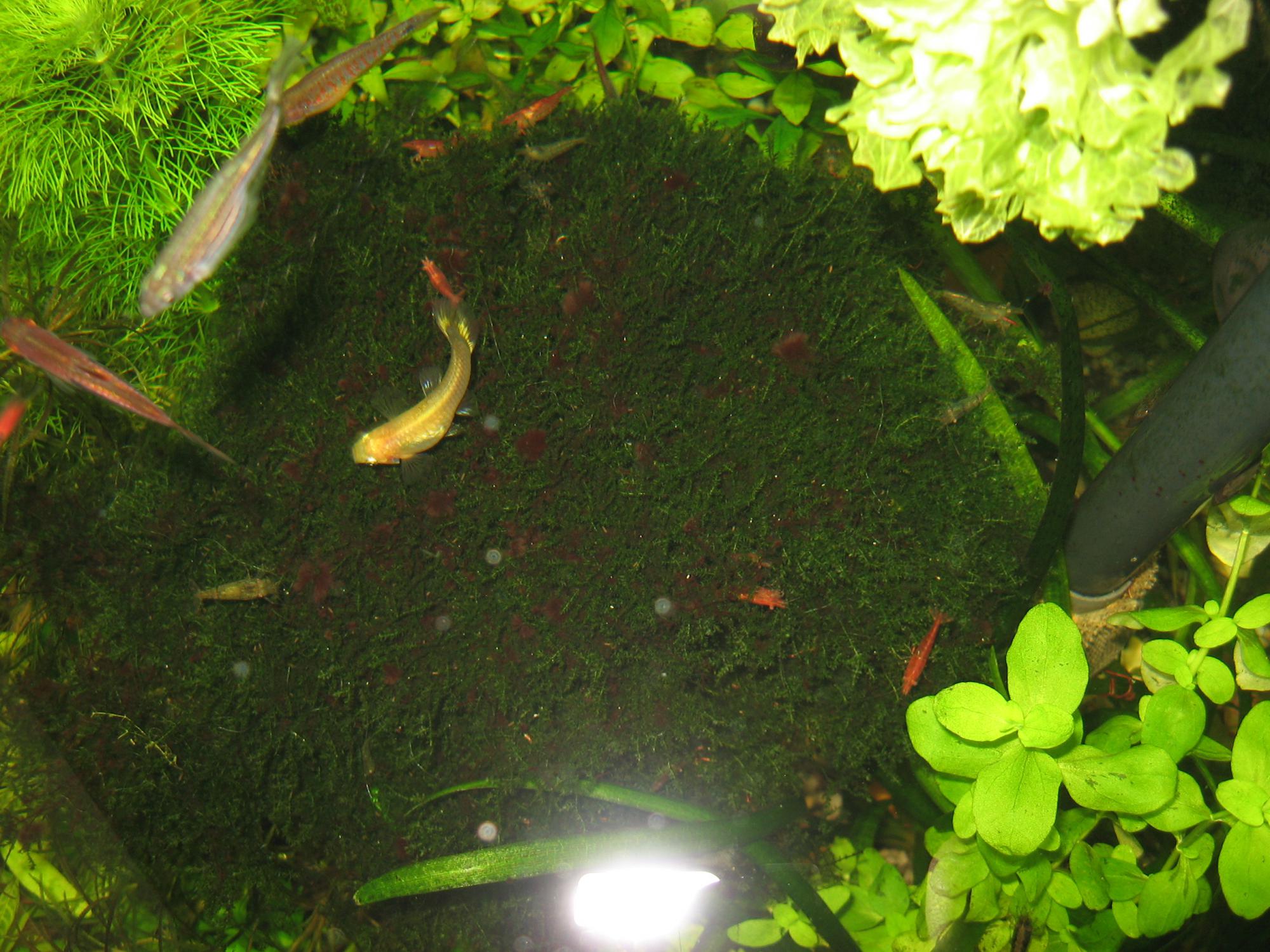 Я туда добавил трех черри из другой банки. Самца и двух самок. Сейчас у меня там чериков больше чем неокаридин. В доказательство, пару фоток некоторых участков аквариума...