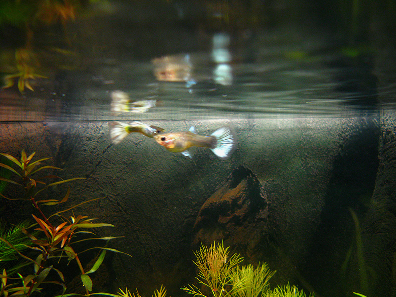 Комментарии к фото. Гуппи, как вы знаете, фотографировать очень сложно, поэтому, как все поняли, полноценно передать внешний вид рыбки не удалось. На первой картинке самка с привычным серым туловищем. На последнем фото - другая самка, которая имеет светло-желтое тельце. Все три фотографии, кроме первой, сделаны ночью, чтобы хоть как-то поймать этих шустряков. Поэтому рыбки бледные и испуганные. Испуг выкатан, можно не переживать.