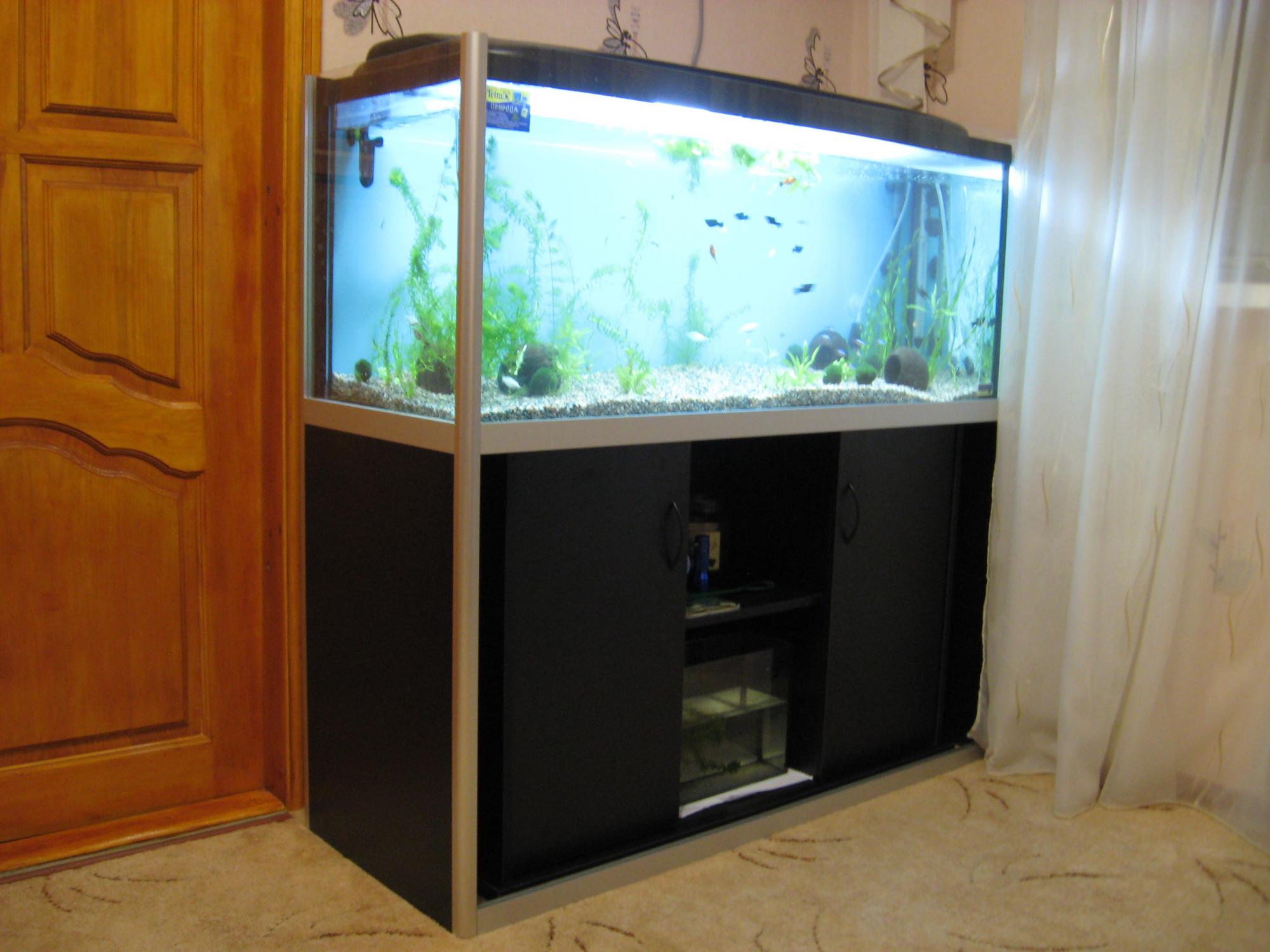 Вместе с аквариумом сразу купил тумбу и пластиковую крышку.