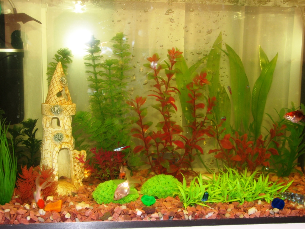 Да дело в том, что я уже, наверное, год просила аквариум у мужа, люблю все живое, у нас дома еще и хомячок! Читала много о воде, о рыбках, знаю, что золотушки любят ковырять дно, съедают зеленуху (поэтому водоросли у меня искусственные). Муж-то, собственно говоря, купил мне акву, фильтр и компрессор. Не успели о таком подарке узнать родственники, как в течение недели у меня появились 5 золотух, и 6 неонов. Хотя я читала, что 65л. это мало для такого количества рыб, но уже ничего пока не поделать. Читала также, что как только неон сможет поместиться у золотухи во рту, она его съест, но я надеюсь на чудо!!! Одно радует, что мужу тоже аква пришлась по душе, так что надеюсь, что пусть не в этом году, но у меня появится более большой аквариум!