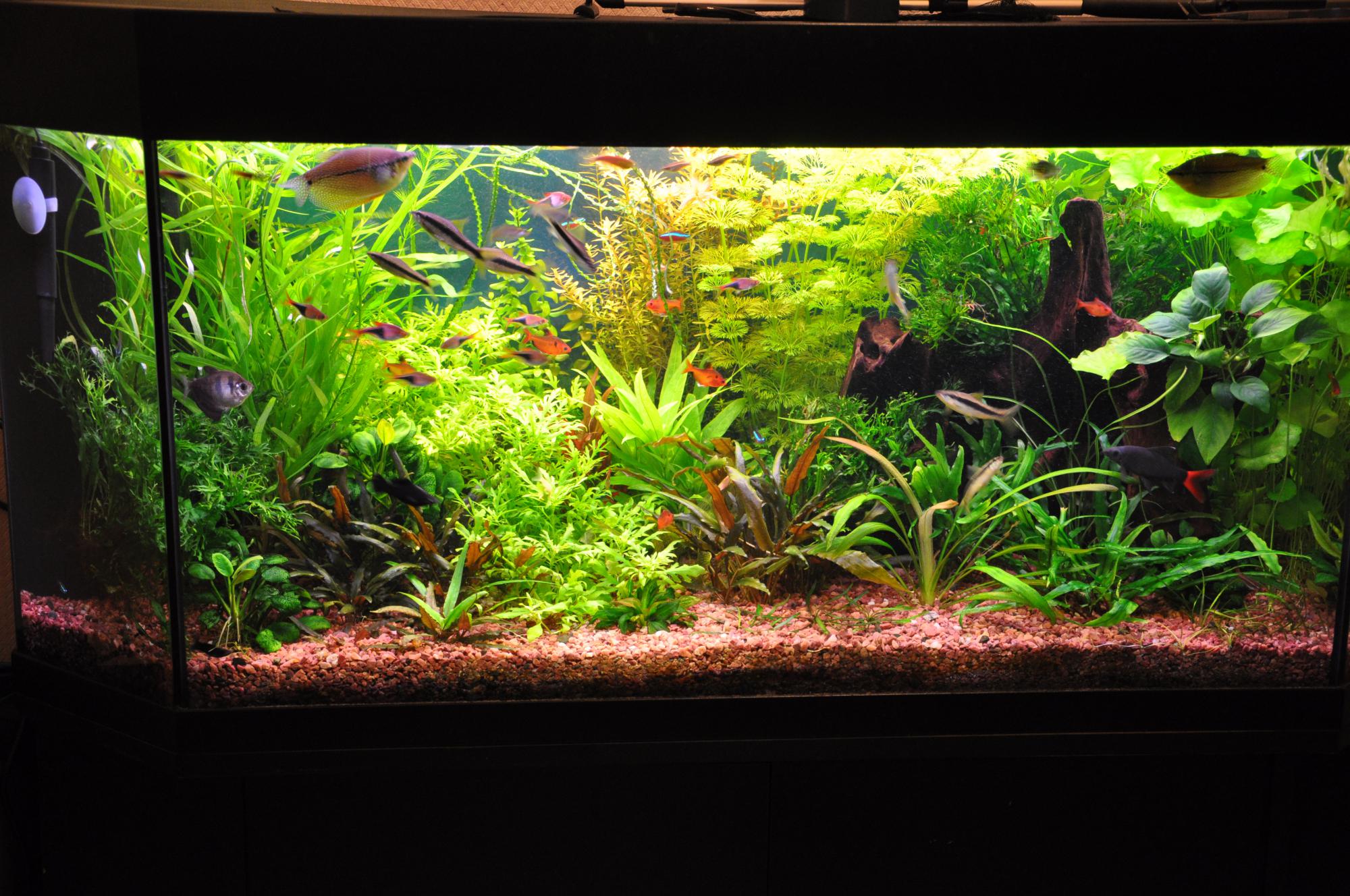 Мне кажется , что вам нужно прикупить где-нибудь красивую коряжку,поменять фон на чёрный или темно-синий(плёнка оракал),на пару см поднять уровень воды что-бы свет от ламп не пробивал через стекло там где нету воды(надеюсь понятно высказался), и конечно же немножко слева травы убрать.
