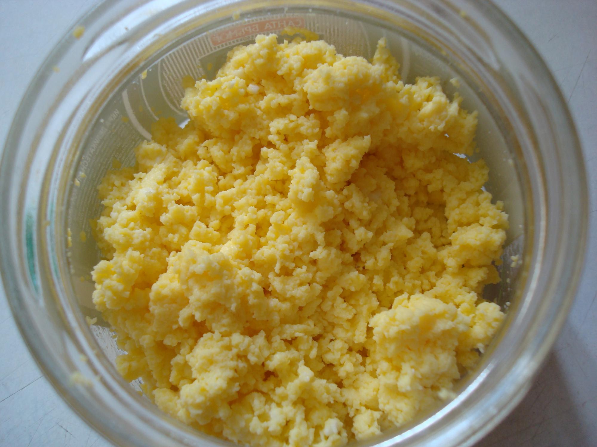 Яйцо с добавлением сахара и соли взбивают вилкой, добавляют молоко, перемешивают и подогревают на медленном огне на сковороде без жира до испарения влаги. Масса приобретает вид творога. Лишнюю влагу выжимаем под грузом. Хранят в холодильнике.