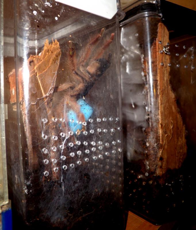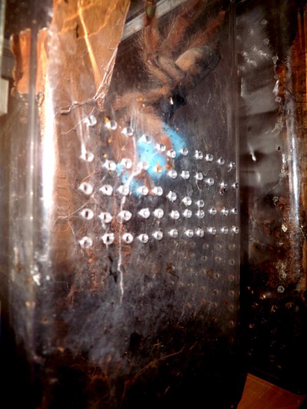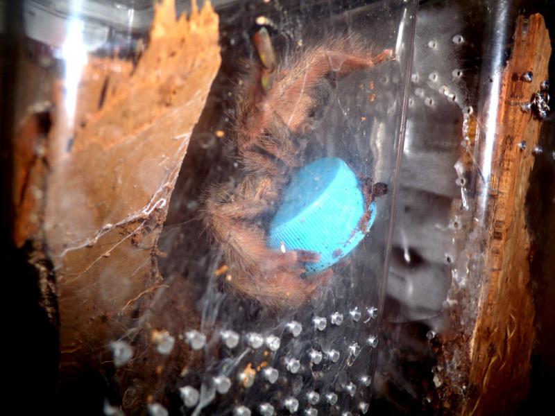 Вчера вечером приключилась такая история.Я сидел в комнате с пауками и вдруг услышал странные звуки. На данный момент тарабанят два самца пецилы и звуки с полок должны были быть привычные, как барабанная дробь. Эти же были странные ,не ритмичные и более громкие. Когда я разглядел в чем дело , решил сделат пару снимков необычной картины.Самка 7-8 линьки псалма пульхры раз за разом поднимала с грохотом крышку от баклашки к потолку терра и брасала её вниз. Делала она это резво и упорно . Методично по кругу, до того,что мне захотелось напугать её ,чтоб закончить эту цикличную вакханалию.