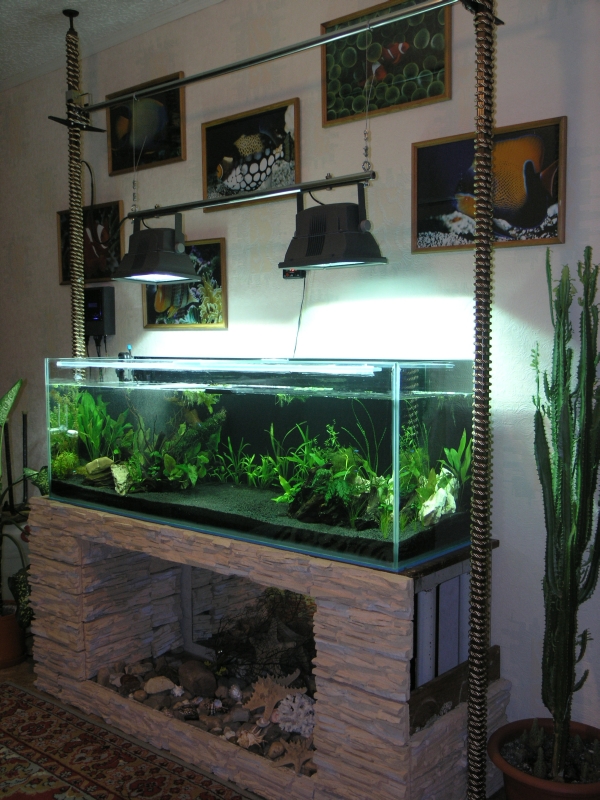 аквариум понравился,красиво  - только не понятно почему смешали пресноводный аквариумный дизайн с морским интерьером...
