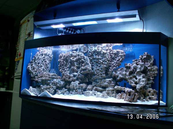 Раз море так всё должно быть оригинальным. Поначалу хотелось аквариум с передним стеклом в виде волны. Наши поставщики делают такие аквариумы под польскую крышку, но маленькая высота – 50 см, хотелось 60. После очень коротких поисков пыл охладел – за стекло одна харьковская фирма захотела 1200,00 грн., безмерная жадность в нашей стране не порок  , это при том что аквариум с передним стеклом ”Волна” и уже со своим интересом мы продаем за 479,00 грн. Ну что ж купили стекло ”Овал” 150 см / 57 см за 165,00 грн. Аквариум получился полуугловой – длина 135 см, ширина слева 80 см, ширина справа 15 см, высота 57 см, слева в углу сделали вырез – место под пеноотделитель. Вот и готов аквариум, примерный объём 350,00 литров. Заднюю и боковую левую стенки покрасили синей краской.