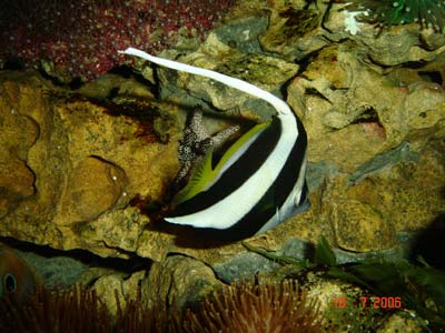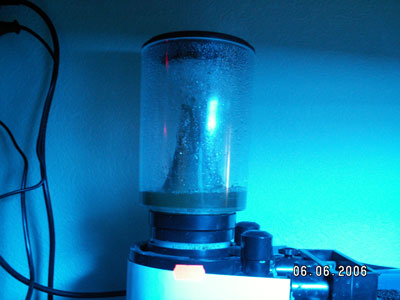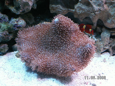 После первой посадки животных аквариум был красавец чуть больше суток - дети прыгали и кричали: - Мама это же Немо! Взрослые не могли поверить что всё живое (и сейчас какждый второй задаёт такой же вопрос). Актинию скорее всего засосало в перемешивающую помпу и порвало на кусучки, нашли только пол чайной ложечки соплей. Остановился пенник, вода белая, сразу поплохело большому премнасу и к вечеру он погиб, на второй день не нашли маньшего премнаса и ещё через 3 дня пропал центропиг. 2 раза подменили воду по 30 литров, на пеннике почти полностью убрали воздух и он начал собирать кое-какие сопли на внутренней стороне чашки. Аквариум вытянула из штопора канистра и УВ. Аквариум востановился через 4 дня полностью, из рыб выжила только крылатка.