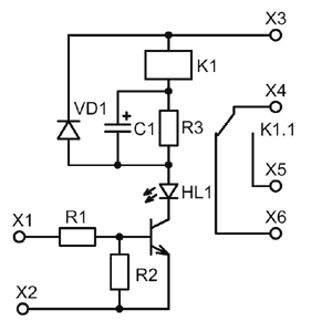 Все четыре канала блока реле выполнены по идентичным схемам. Каждый канал состоит из транзисторного ключа VT1…VT4, электромагнитного реле K1…K4, светодиода VD5…VD8. Светодиод VD5…VD8 индицирует срабатывание реле K1…K4. Резисторный делитель в цепи базы транзистора VT1…VT4 обеспечивает привязку напряжения срабатывания устройства к стандартным ТТЛ уровням. В цепь коллектора VT1…VT4, через параллельно соединённые резистор R9…R12 и конденсатор C1…C4, включена обмотка электромагнитного реле K1…K4, контактная группа K1.1…K4.1 которого замыкает-размыкает (в зависимости от точек подключения нагрузки, а именно точки X8…X11-X12…X15 на замыкание, X8…X11-X16…X19 на размыкание реле соответственно) цепь питания нагрузки. При замыкании электронного ключа VT1…VT4, конденсатор C1…C4, заряжаясь через обмотку реле K1…K4, создаёт импульс тока, достаточный для притяжения якоря этого реле. После заряда конденсатора якорь реле удерживается меньшим током, протекающим через резистор R9…R12, что делает устройство экономичнее с точки зрения потребления тока. Диод VD1…VD4 защищает транзистор VT1…VT4 от импульсного пробоя в момент его закрытия.