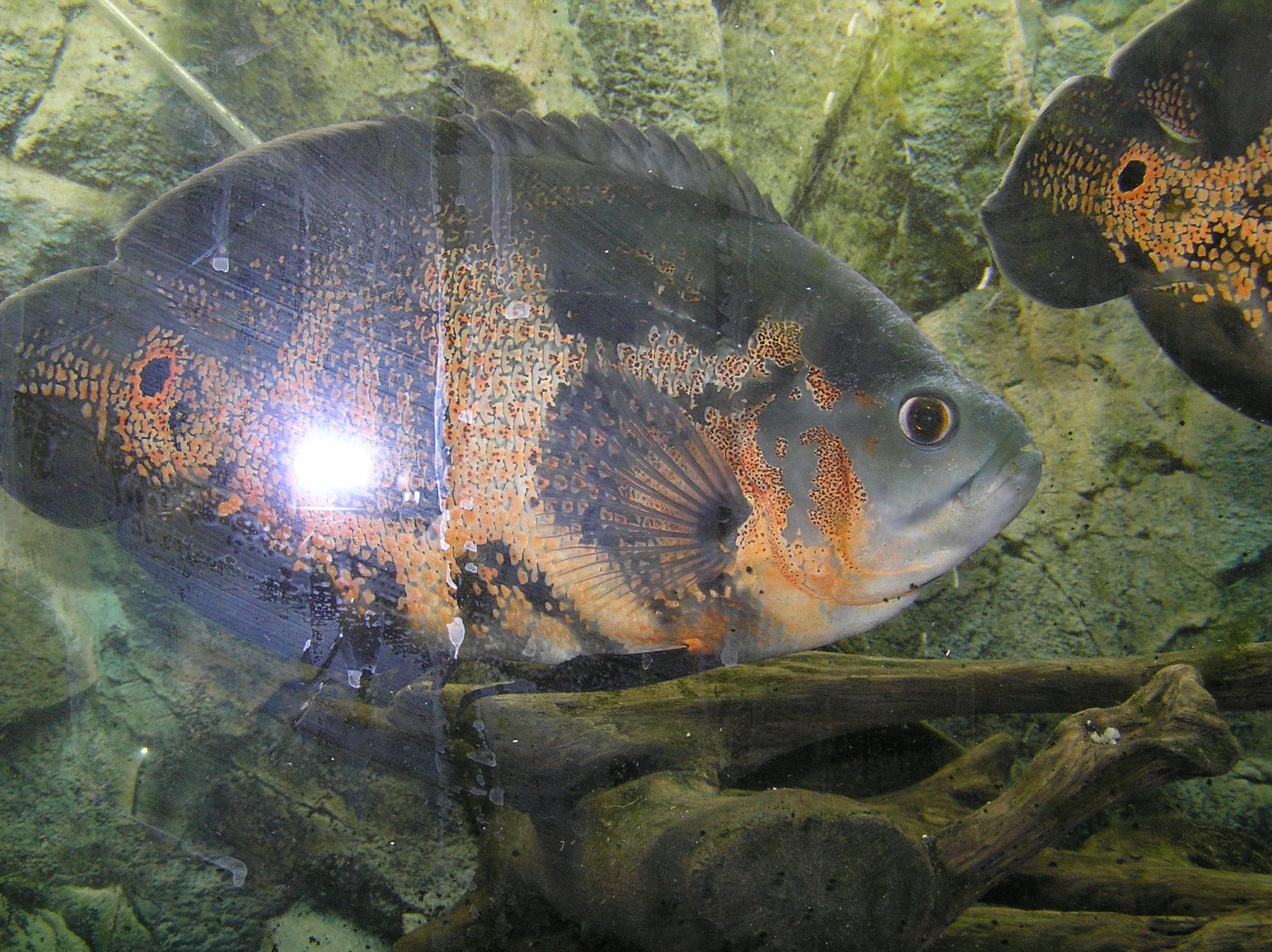 3 астронотуса и один птерик парчевый. Астры - тигры, нашего украинского происхождения (у меня живут год), возраст год и 2 месяца, размер 20 см (+-), птерик партчевый возраст и размет такой же как у астров.