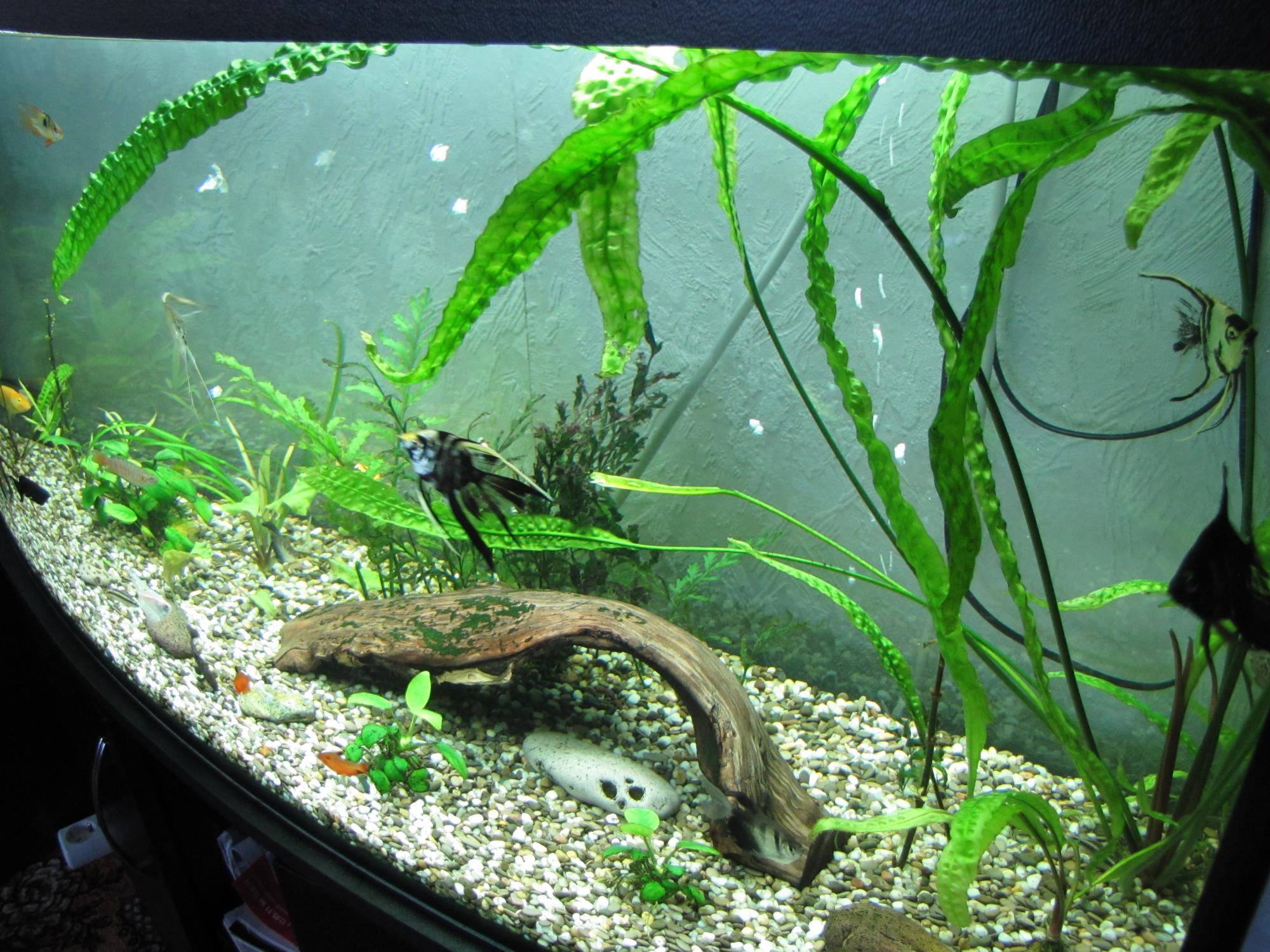 растений вообще толком нет, посадите хоть любую длинностебельку! А то я смотрю водоросли Вас все не обошли стороной.Насчет рыб - нужно остановится - скалярки вырастут, для других мало места будет.
