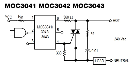 Я подключал MOC304х по схеме даташита с дополнительным симистором http://www.8051projects.info/datasheets/moc3041.pdf , и все замечательно работает.