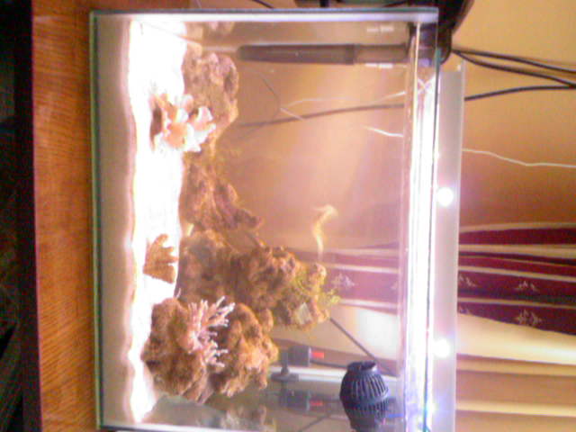 Система простая одна коралина на 900л.час. соль не помню дешовая. камни вродибы нормальные пористые.В фильтре уголь и губка. уголь меняю каждые две недели. Вода осмос подмена роз в неделю 5литров. Температура 25-26градусов.