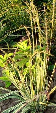 Miscanthus sinensis..Так как видовое растение крайне агрессивно, лучше использовать селекционные формы отличающиеся более "спокойным" ростом..Например-"Variegatus" (справа на снимке)Достигающий высоты 1,7 метра...или " Малый Фонтан" ("Kleine Fontane", слева)- 1,5 метра.