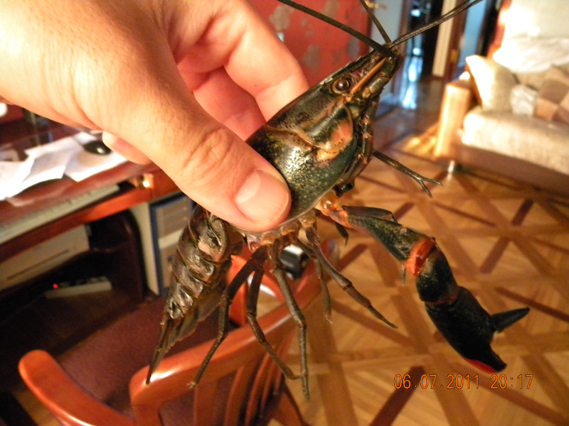 Эту пару хотел оставить себе на замену теперешних производителей, но понял, что поторопился - растут быстро и в одном аквариуме вместе с родителями им стало тесновато. Из их выводка, который уже распродан, были самыми крупными. Самец в ходе последней линьки потерял клешню (к моему сожалению). Пара еще совсем молодая (несмотря на приличные размеры), у самца только прорезалось красное пятно на клешях (клешне), еще не нерестились.