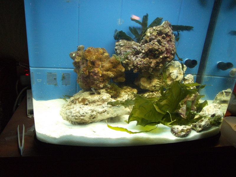 Аквариум всем извесный ресан 500, куплен не новым. В компелкте помимо самой банки достались насос Хидор на 960л/ч, помпа коралия на 900л/ч, пенник РифОктопус ns-80. Долго он ждал своей участи в кладовке, и вот наконец я приобрел соль Tetra, песок арагонитовый 1мм. Потом приехали СРК от Александра Логинова 5 кг