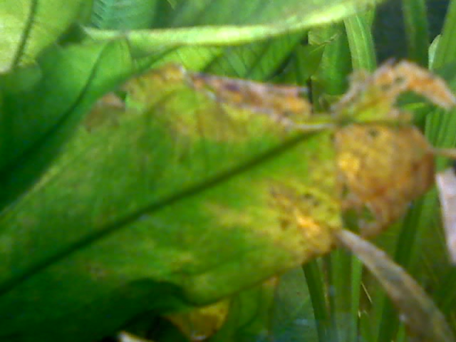 Эхинодорусам как раз интересна и корневая и листовая подкормка. Кроме того, они любят свежую водичку и незакисший, но питательный грунт. А как на мой косой взгляд, в аквариуме избыток органики и, возможно, какого-то элемента. Точно не скажу.
