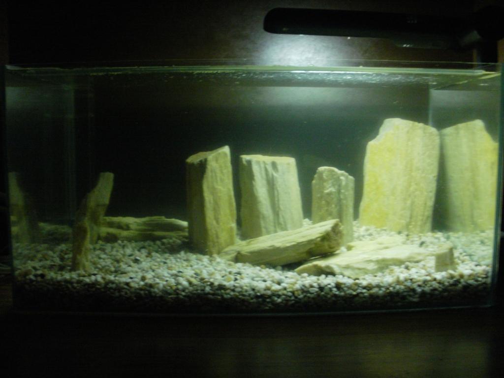 Наконец то на минувших выходных произошел долгожданный запуск нового аквариума на 40л. Главный элементом декора стали камни. По дизайнерскому замыслу они создают иллюзию скалистого дна, а мелкие элементы расставлены в хаотичном порядке. В дальнейшем планируется высадка глоссы, которая, по мере разрастания, покроет дно ровным зеленым ковром. На отдельные камни будет прирощен мох. Думаю выйдет красиво.