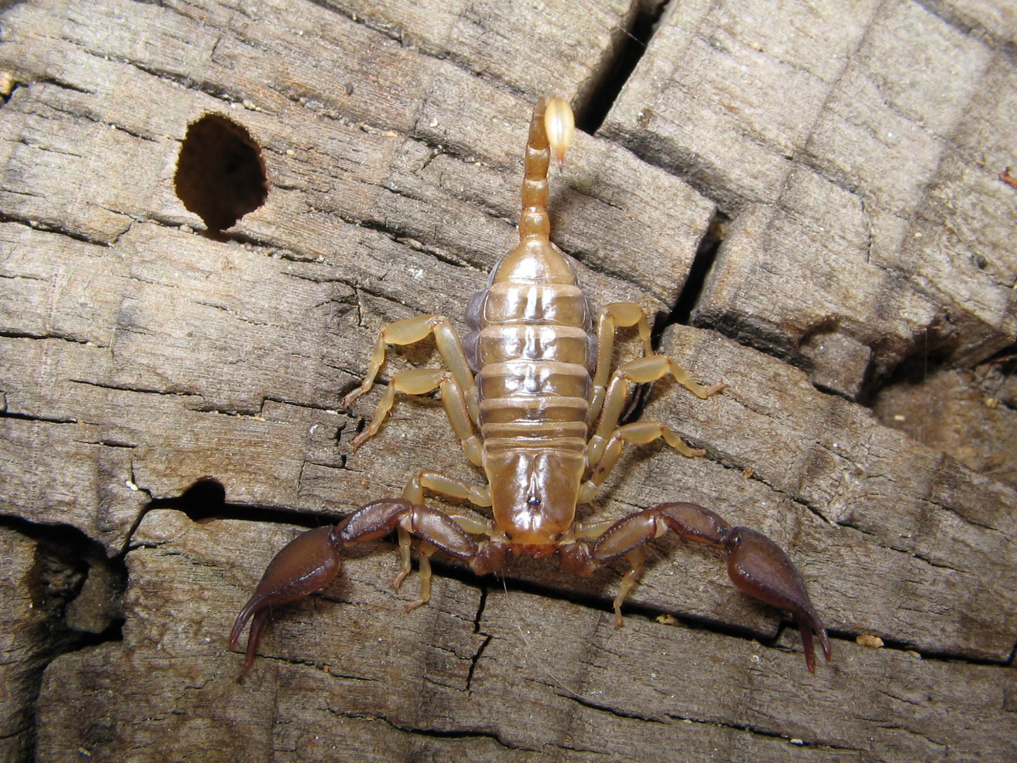 Скорпион крымский, как утверждает энциклопедия, живет только в Крыму. Он светло-желтый, клешни узкие, буроватые, длина 35-40 мм, общая длина тела колеблется от 2 до 6 см. Укус крымского скорпиона не приводит к смерти, но все же вызывает отравление организма.