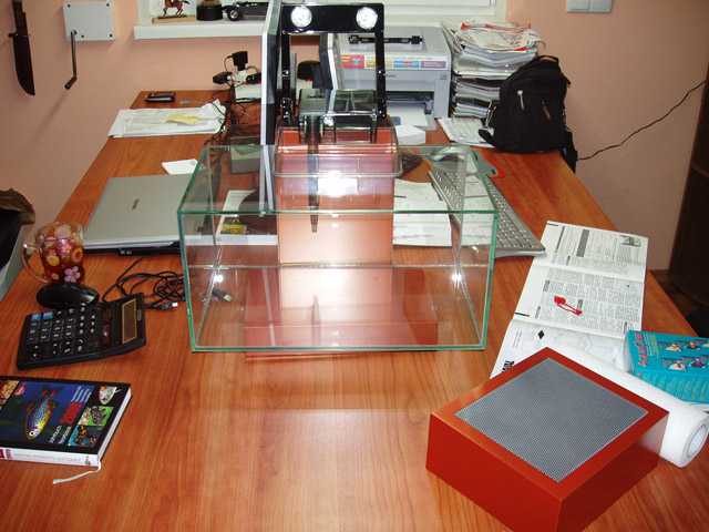 Теперь пройдусь о ощущениях о баночке - с аквариумистикой особо не был связан, так воспоминания из детства, наверно как и у большинства из нас.  Собственно упакован был хорошо, добротно. В наборе находится все что надо для существования данного сабжа: сама баночка (хорошо склеина, но за такие деньги могли бы сделать и идеально), подставка-кожух (в нем скрыли все что надо скрыть), свет (2 лампочки по 10ват, но к сожалению точечные, свет как видите ниже не ахти), фильтр (с наполнитялями (био, хим, механика + губка на заборник). Собственно все. Что хотелось бы - так это фирменный магнитный скребок, в Украине его нет, но это в принципе для маньяков, к коковым себя и отношу  . Сифон лучше брать Деннерлешний для нано - очень удобный, и не надо на меня наподать самоделкинам и обвинять в буржуйстве, просто мне нравится что бы было все хорошее, а мастерить - нет ни времени, ни желания. Обслуживать банку проблематично, что и следовало ожидать от такого горлышка, поэтому с растючкой может я и погорячился, тем более нашел на ЮТУБЕ обалденую реализацию данной баночки