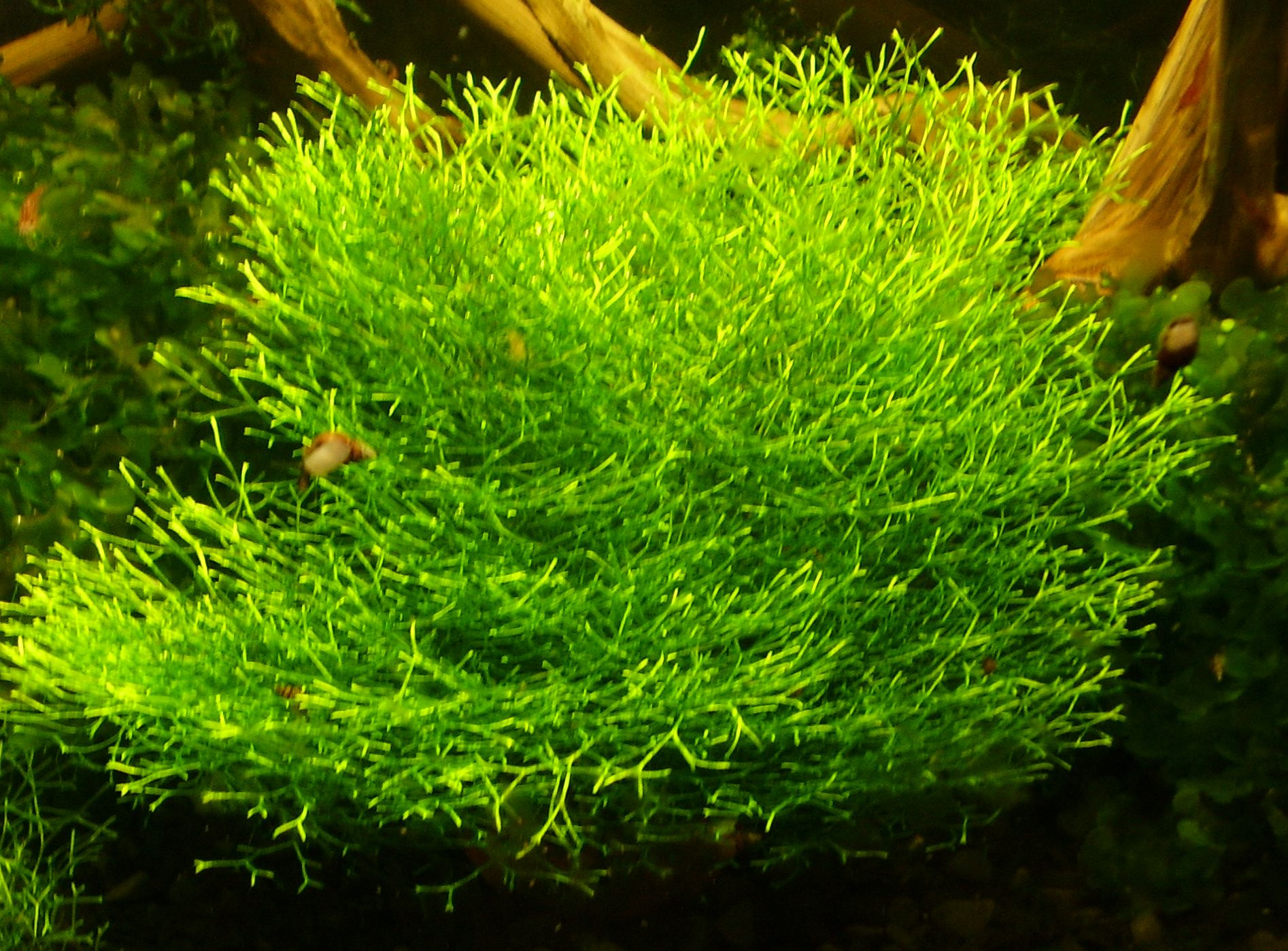 Riccia fluitans spec. или Риччия Амано. При подводном содержании становится более утонченной и вытянутой в отличии от обычной ричии. Гораздо мение подвержена всплыванию к поверхности. Хотя и более требовательна чем обыная ричии, но все же в содержании не сложна