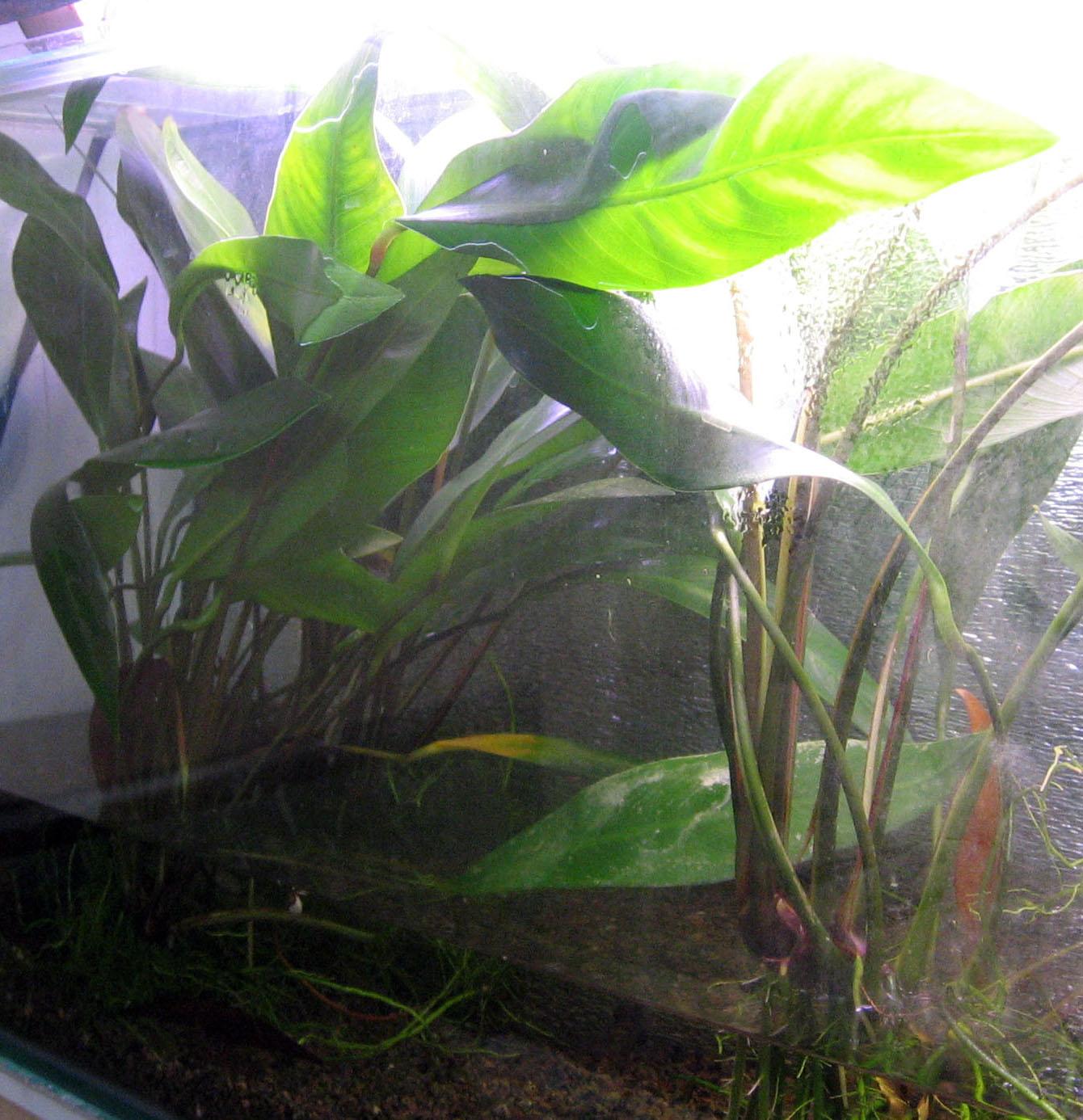 я посадила свои анубиасы в прозрачное пластиковое ведерко, на дно - немного грунта и залила водой. поставила на подоконник. стоят неделю без изменений.