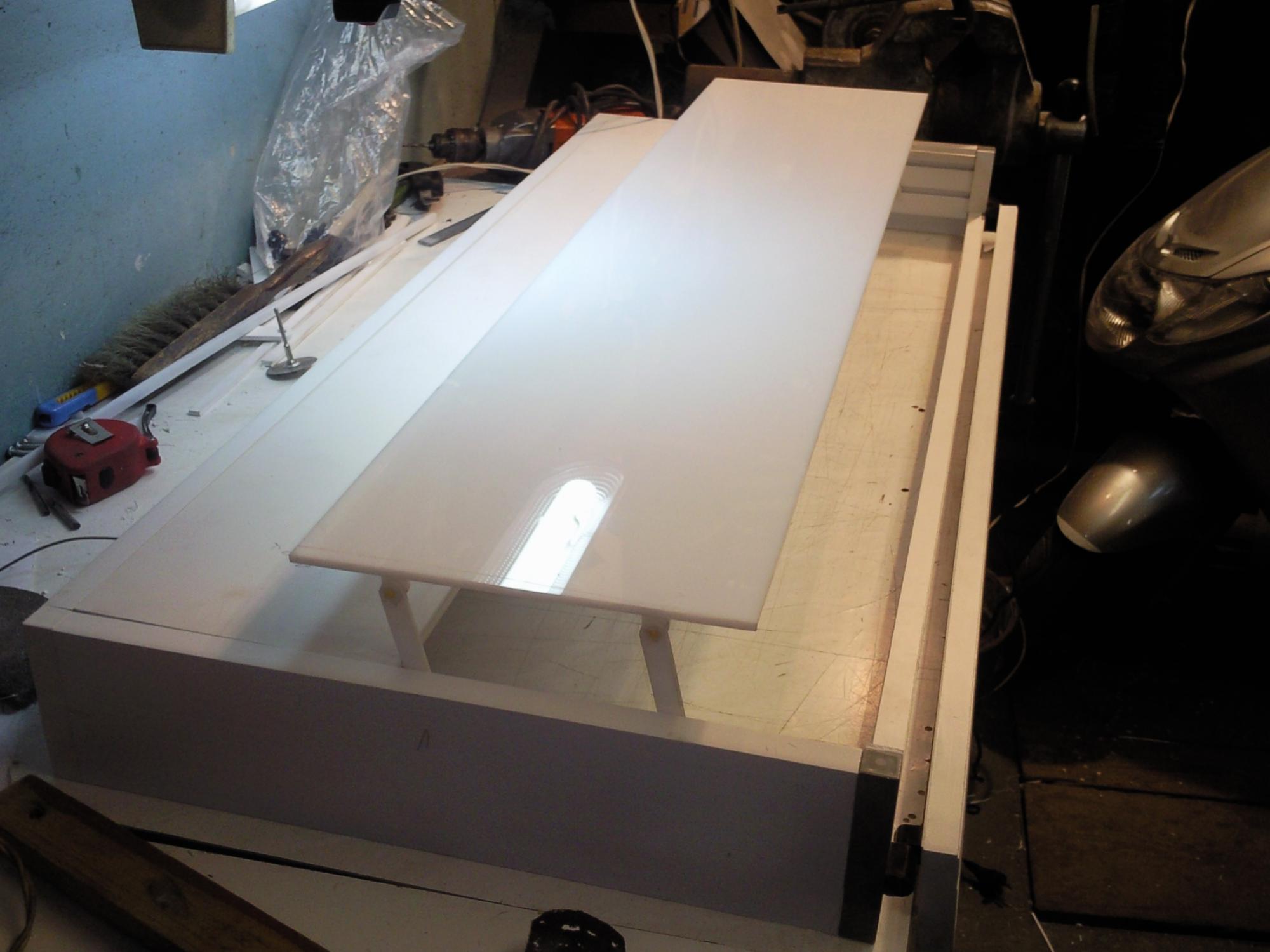 Эта крышка под 4шт Т5, размер 950*390. Верхняя открывающаяся часть из акрила 4мм с жесткостью